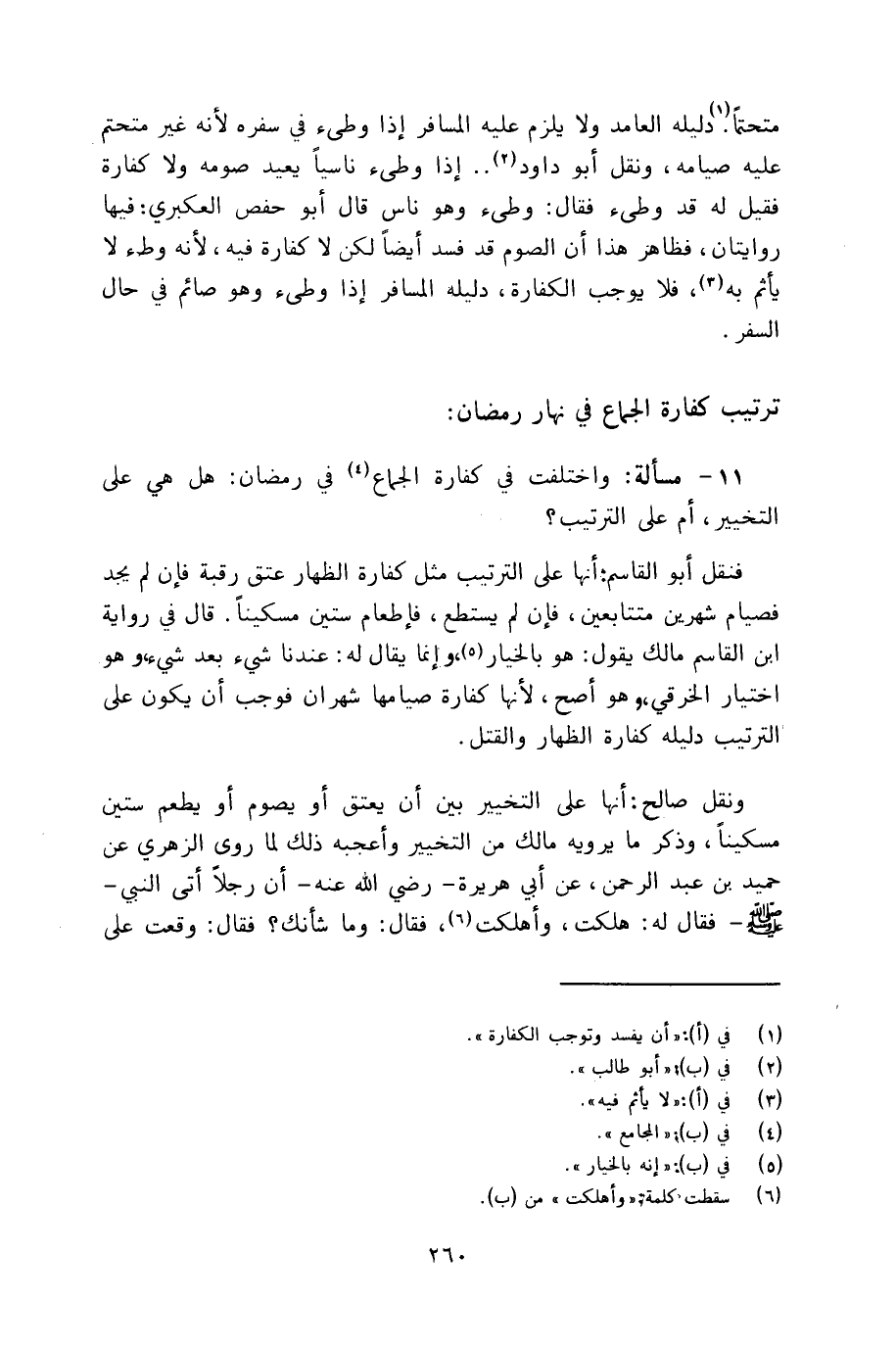 ونقل صالح: أنها على التخيير بين أن يعتق أو يصوم أو يطعم ستين مسكيناً، وذكر ما يرويه مالك من التخيير وأعجبه ذلك لما روى الزهري عن حميد بن عبد الرحمن، عن أبي هريرة ـ رضي الله عنه ـ أن رجلاً أتى النبي ـ صلى الله عليه وسلم فقال له: هلكت، وأهلكت، فقال: وما شأنك؟ فقال: وقعت على