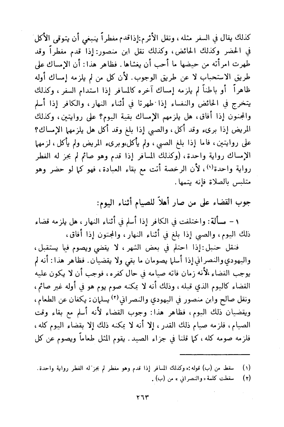كذلك يقال في السفر مثله، ونقل الأثرم: إذا قدم مفطراً ينبغي أن يتوقى الأكل في الحضر وكذلك الحائض، وكذلك نقل ابن منصور: إذا قدم مفطراً وقد طهرت امرأته من حيضها ما أحب أن يغشاها. فظاهر هذا: أن الإمساك على طريق الاستحباب لا عن طريق الوجوب. لأن كل من لم يلزمه إمساك أوله ظاهراً أو باطناً لم يلزمه إمساك آخره كالمسافر إذا استدام السفر، وكذلك يتخرج في الحائض والنفساء إذا طهرتا في أثناء النهار، والكافر إذا أسلم والمجنون إذا أفاق، هل يلزمهم الإمساك بقية اليوم؟ على روايتين، وكذلك المريض إذا برىء وقد أكل، والصبي إذا بلغ وقد أكل هل يلزمهما الإمساك؟ على روايتين، فأما إذا بلغ الصبي، ولم يأكل، وبرىء المريض ولم يأكل، لزمهما الإمساك رواية وحدة، (وكذلك المسافر إذا قدم وهو صائم لم يجز له الفطر رواية واحدة، لأن الرخصة أتت مع بقاء العبادة، فهو كما لو حضر وهو متلبس بالصلاة فإنه يتمها.