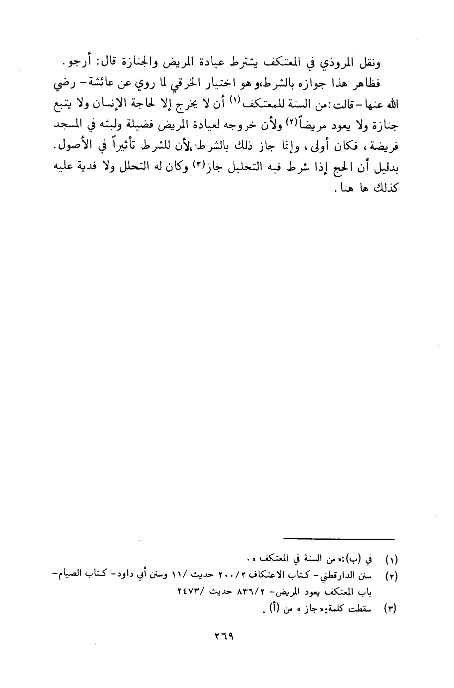 فظاهر هذا جوازه بالشرط، وهو اختيار الخرقي لما روي عن عائشة ـ رضي الله عنها ـ قالت: من السنة للمعتكف أن لا يخرج إلا لحاجة الإنسان ولا يتبع جنازة ولا يعود مريضاً ولأن خروجه لعيادة المريض فضيلة ولبثه في المسجد فريضة، فكان أولى، وإنما جاز ذلك بالشرط، لأن للشرط تأثيراً في الأصول. بدليل أن الحج إذا شرط فيه التحليل جاز وكان له التحلل ولا فدية عليه كذلك هاهنا.