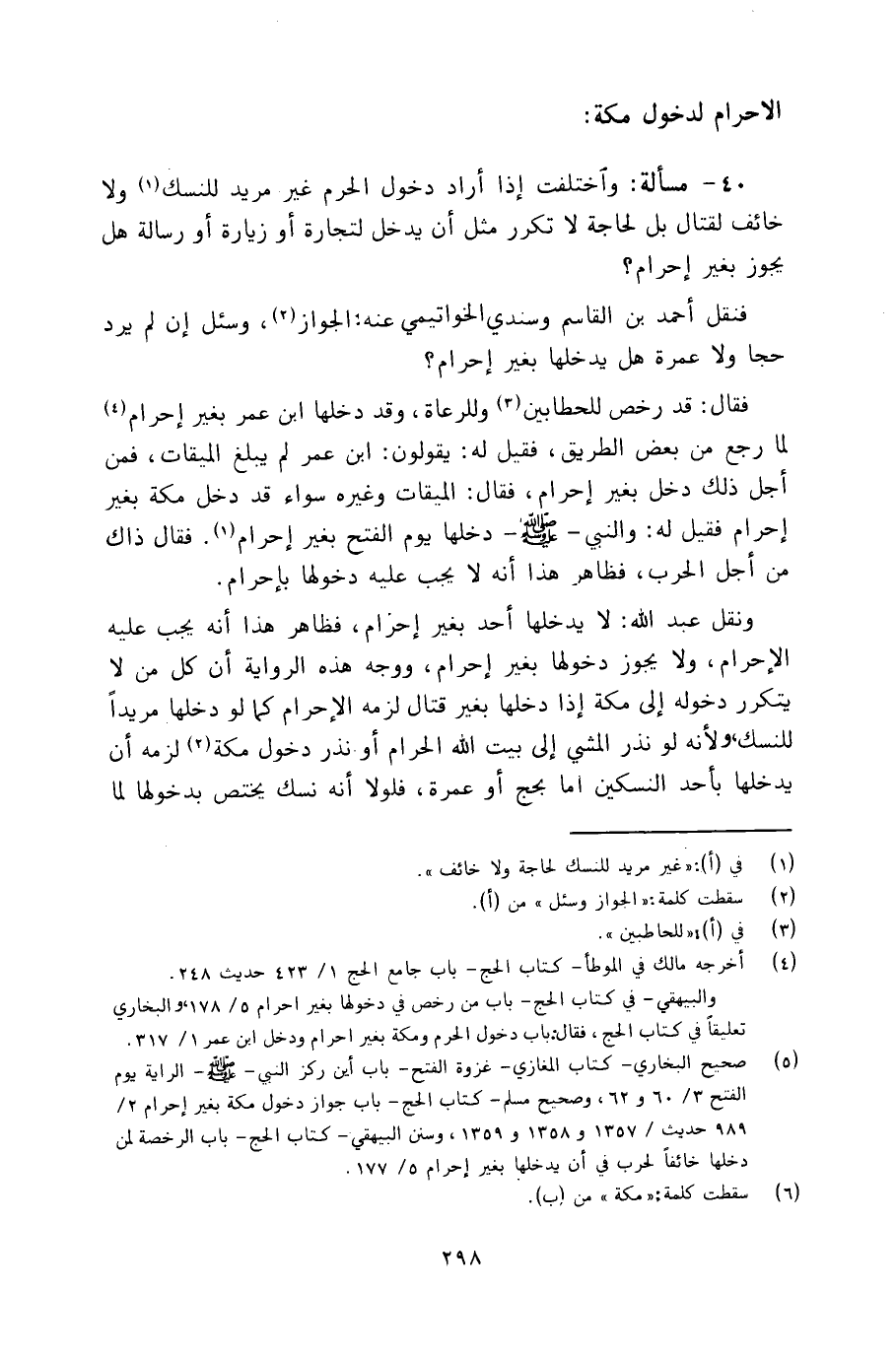 ٤٠ - مسألة: واختلفت إذا أراد دخول الحرم غير مريد للنسك ولا خائف لقتال بل لحاجة لا تكرر مثل أن يدخل لتجارة أو زيارة أو رسالة هل يجوز بغير إحرام؟