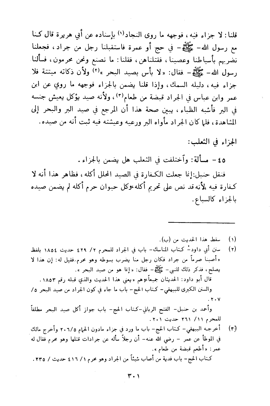قلنا: لا جزاء فيه، فوجهه ما روى النجاد بإسناده عن أبي هريرة قال كنا مع رسول الله ـ صلى الله عليه وسلم في حج أو عمرة فاستقبلنا رجل من جراد، فجعلنا نضربهم بأياطنا وعصينا، فقتلناهن، فقلنا: ما نصنع ونحن محرمون، فسألنا رسول الله ـ صلى الله عليه وسلم فقال: لا بأس بصيد البحر ولأن ذكاته ميتة فلا جزاء فيه، دليله السمك، وإذا قلنا يضمن بالجزاء فوجهه ما روي عن ابن عمر وابن عباس في الجراد قبضة من طعام، ولأنه صيد يؤكل يعيش جنسه في البر فأشبه الظباء، يبين صحة هذا أن المرجع في صيد البر والبحر إلى المشاهدة، فلما كان الجراد مأواه البر ورعيه وعيشته فيه ثبت أنه من صيده.