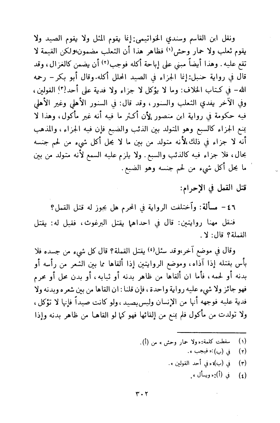 ونقل ابن القاسم وسندي الخواتيمي: إنما يقوم المثل ولا يقوم الصيد ولا يقوم ثعلب ولا حمار وحش فظاهر هذا أن الثعلب مضمون، ولكن القيمة لا تقع عليه. وهذا أيضاً مبني على إباحة أكله فوجب أن يضمن كالغزال، وقد قال في رواية حنبل: إنما الجزاء في الصيد المحلل أكله. وقال أبو بكر ـ رحمه الله ـ في كتاب الخلاف: وما لا يؤكل لا جزاء ولا فدية على أحد القولين، وفي الآخر يفدي الثعلب والسنور، وقد قال: في السنور الأهلي وغير الأهلي فيه حكومة في رواية ابن منصور، لأن أكثر ما فيه أنه غير مأكول، وهذا لا يمنع الجزاء كالسبع وهو المتولد بين الذئب والضبع فإن فيه الجزاء، والمذهب أنه لا جزاء في ذلك، لأنه متولد من بين ما لا يحل أكل شيء من لحم جنسه بحال، فلا جزاء فيه كالذئب والسبع. ولا يلزم عليه السمع لأنه متولد من بين ما يحل أكل شيء من لحم جنسه وهو الضبع.