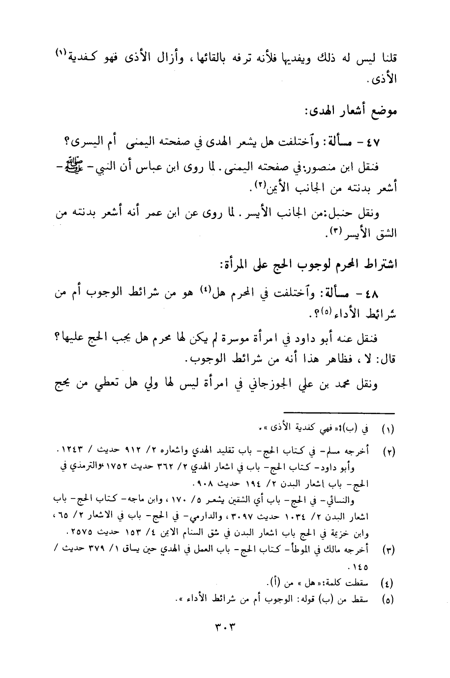 ٤٧ - مسألة: واختلفت هل يشعر الهدى في صفحته اليمنى أم اليسرى؟