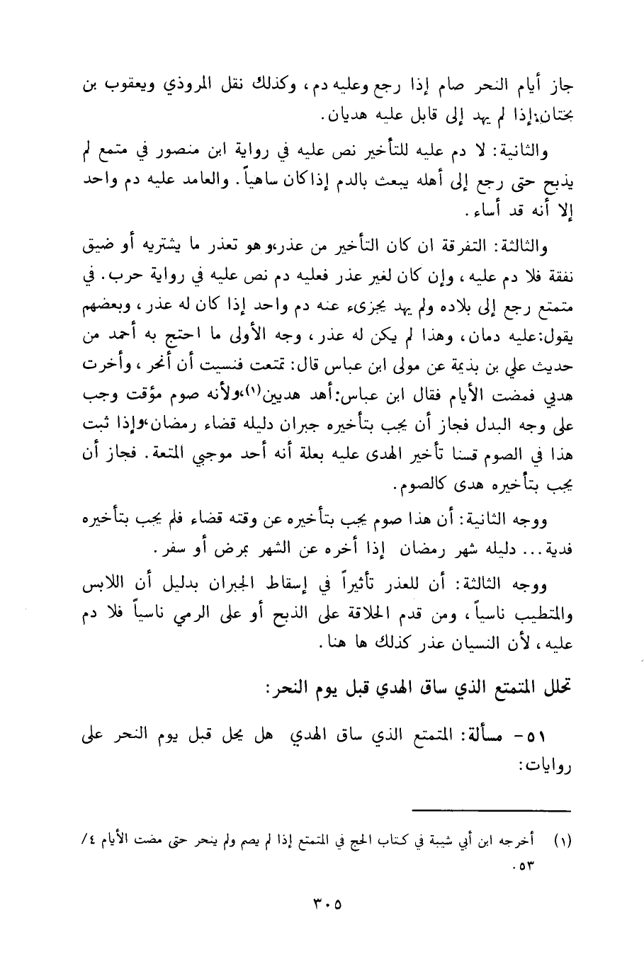 والثالثة: التفرقة إن كان التأخير من عذر، وهو تعذر ما يشتريه أو ضيق نفقة فلا دم عليه، وإن كان لغير عذر فعليه دم نص عليه في رواية حرب. في متمتع رجع إلى بلاده ولم يهد يجزئ عنه دم واحد إذا كان له عذر، وبعضهم يقول: عليه دمان، وهذا لم يكن له عذر، وجه الأولى ما احتج به أحمد من حيدث علي بن بذيمة عن مولى ابن عباس قال: تمتعت فنسيت أن أنحر، وأخرت هديي فمضت الأيام فقال ابن عباس: أهد هديين، ولأنه صوم مؤقت وجب على وجه البدل فجاز أن يجب بتأخيره جبران دليله قضاء رمضان، وإذا ثبت هذا في الصوم قسنا تأخير الهدي عليه بعلة أنه أحد موجبي المتعة. فجاز أن يجب بتأخيره هدي كالصوم.