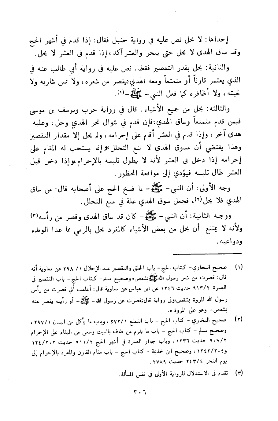 والثالثة: يحل من جميع الأشياء. قال في رواية حرب ويوسف بن موسى فيمن قدم متمتعا وساق الهدي: فإن قدم في شوال نحر الهدي وحل، وعليه هدي آخر، وإذا قدم في العشر أقام على إحرامه ولم يحل إلا مقدار التقصير، وهذا يقتضي أن مسوق الهدي لا يمنع التحلل، وإنما يستحب له المقام على إحرامه إذا دخل في العشر؛ لأنه لا يطول تلبسه بالإحرام، وإذا دخل قبل العشر طال تلبسه فيؤدي إلى مواقعة المحظور.