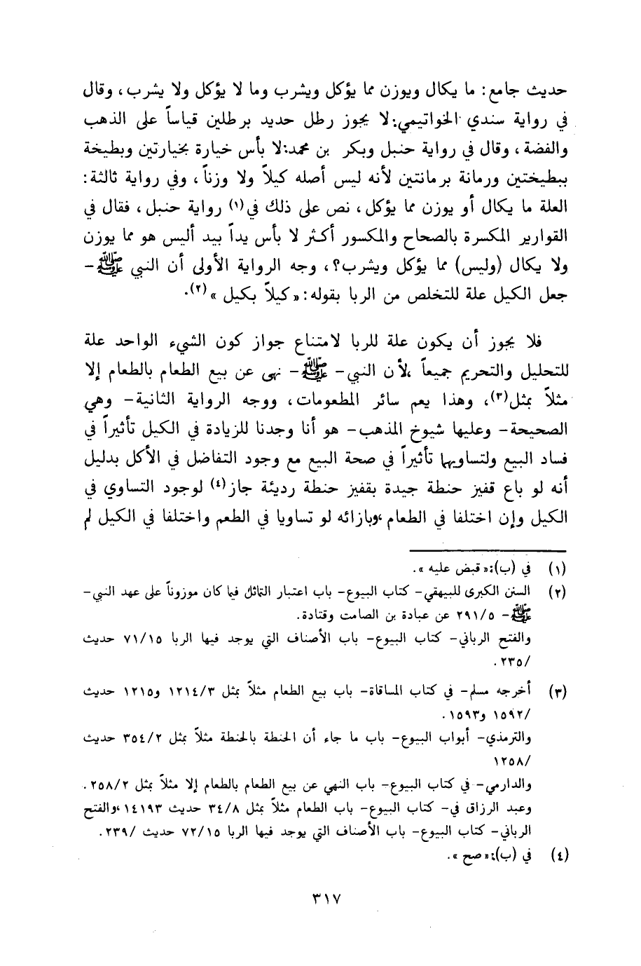 حديث جامع: ما يكال ويوزن مما يؤكل ويشرب ما لا يؤكل ولا يشرب، وقال في رواية سندي الخواتيمي: لا يجوز رطل حديد برطلين قياساً على الذهب والفضة، وقال في رواية حنبل وبكر بن محمد: لا بأس خيارة بخيارتين وبطيخة ببطيختين ورمانة برمانتين لأنه ليس أصله كيلاً ولا وزناً/ وفي رواية ثالثة: العلة ما يكال أو يوزن مما يؤكل، نص على ذلك في رواية حنبل، فقال في القوارير المكسرة بالصحاح والمكسور أكثر لا بأس يداً بيد أليس هو مما يوزن ولا يكال (وليس) مما يؤكل ويشرب؟ وجه الرواية الأولى أن ـ النبي صلى الله عليه وسلم ـ جعل الكيل علة للتخلص من الربا بقوله: كيلاً بكيل.