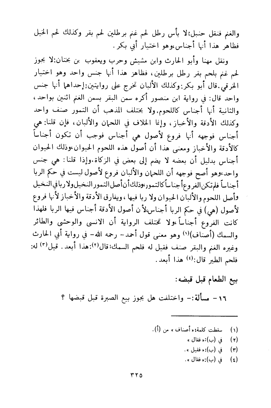 ونقل مهنا وأبو الحارث وابن مشيش وحرب ويعقوب بن بختان: لا يجوز لحم غنم بلحم بقر رطل برطلين، فظاهر هذا أنها جنس واحد وهو اختيار الخرقي قال أبو بكر: وكذلك الألبان تخرج على روايتين: إحداهما أنها جنس واحد قال: في رواية ابن منصور أكره سمن البقر بسمن الغنم اثنين بواحد، والثانية أنها أجناس كاللحوم. ولا يختلف المذهب أن التمور صنف واحد وكذلك الأدقة والأخباز، وإنما الخلاف في اللحمان والألبان، فإن قلنا: هي أجناس فوجهه أنها فروع لأصول هي أجناس فوجب أن نكون أجناساً كالأدقة والأخباز ومعنى هذا أن أصول هذه اللحوم الحيوان، وذلك الحيوان أجناس بدليل أن بعضه لا يضم إلى بعض في الزكاة. وإذا قلنا: هي جنس واحد، وهو أصح فوجهه أن اللحمان والألبان فروع لأصول ليست في حكم الربا أجناساً فلم تكن الفروع أحناساً كالتمور، وذلك أن أصل التمور النخيل ولا ربا في النخيل وأصل اللحوم والألبان لحيوان ولا ربا فيها، ويفارق الأدقة والأخباز لأنها فروع لأصول (هي) في حكم الربا أجناس، لأن أصول الأدقة أجناس فيها الربا فلهذا كانت الفروع أجناساً، ولا تختلف الرواية أن الأنسى والوحشي والطائر والسمك (أصناف) وهو معنى قول أحمد ـ رحمه الله ـ في رواية أبي الحارث وغيره الغنم والبقر صنف فقيل له فلحم السمك: قال: هذا أبعد. قيل له: فلحم الطير قال: هذا أبعد.