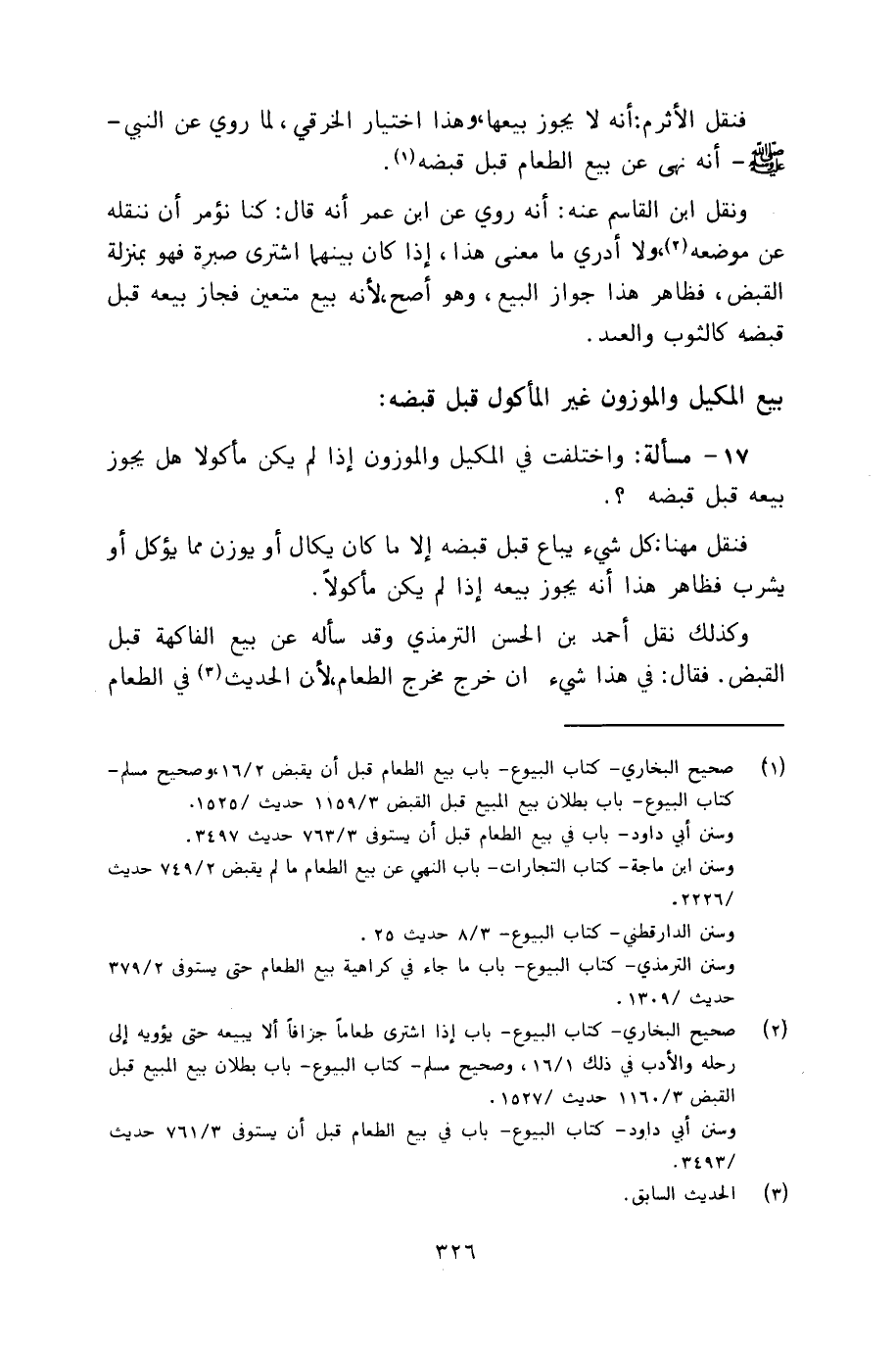 وكذلك نقل أحمد بن الحسن الترمذي وقد سأله عن بيع الفاكهة قبل القبض. فقال: في هذا شيء إن خرج مخرج الطعام، لأن الحديث في الطعام