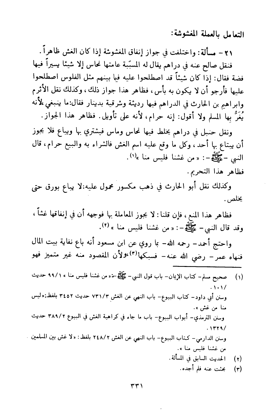 ٢١ - مسألة: واختلفت في جواز إنفاق المغشوشة إذا كان الغش ظاهراً.