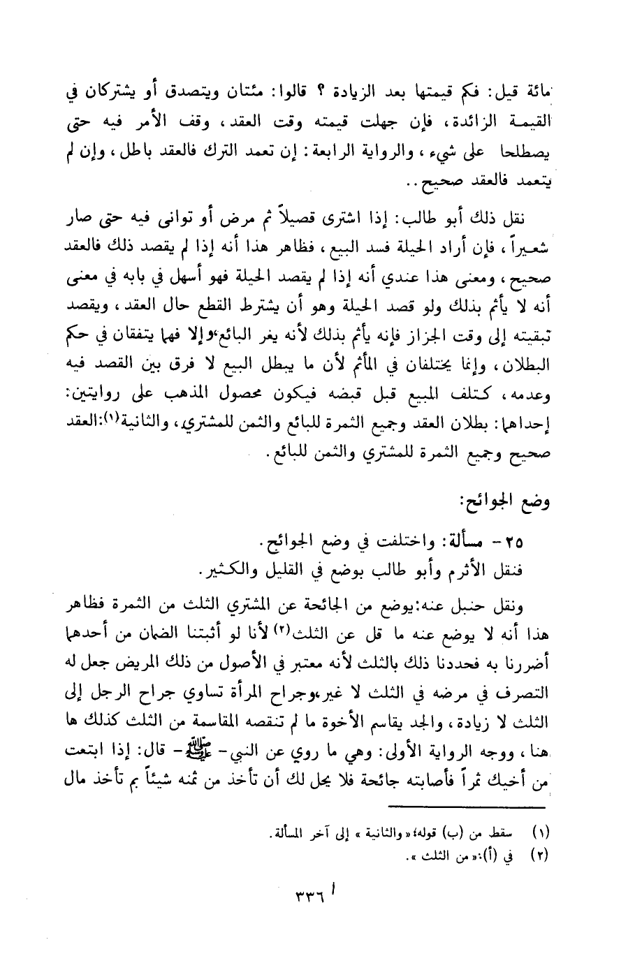 ونقل حنبل عنه: يوضع من الجائحة عن المشتري الثلث من الثمرة فظاهر هذا أنه لا يوضع عنه ما قلّ عن الثلث لأنا لو أثبتنا الضمان من أحدهما أضررنا به فحددنا ذلك بالثلث لأنه معتبر في الأصول من ذلك المريض جعل له التصرف في مرضه في الثلث لا غير، وجراح المرأة تساوي جراح الرجل إلى الثلث لا زيادة، والجد يقاسم الأخوة ما لم تنقصه المقاسمة من الثلث كذلك ها هنا/ ووجه الرواية الأولى: وهي ما روي عن ـ النبي صلى الله عليه وسلم ـ قال: إذا ابتعت من أخيك ثمراً فأصابته جائحة فلا يحل لك أن تأخذ من ثمنه شيئاً بم تأخذ مال