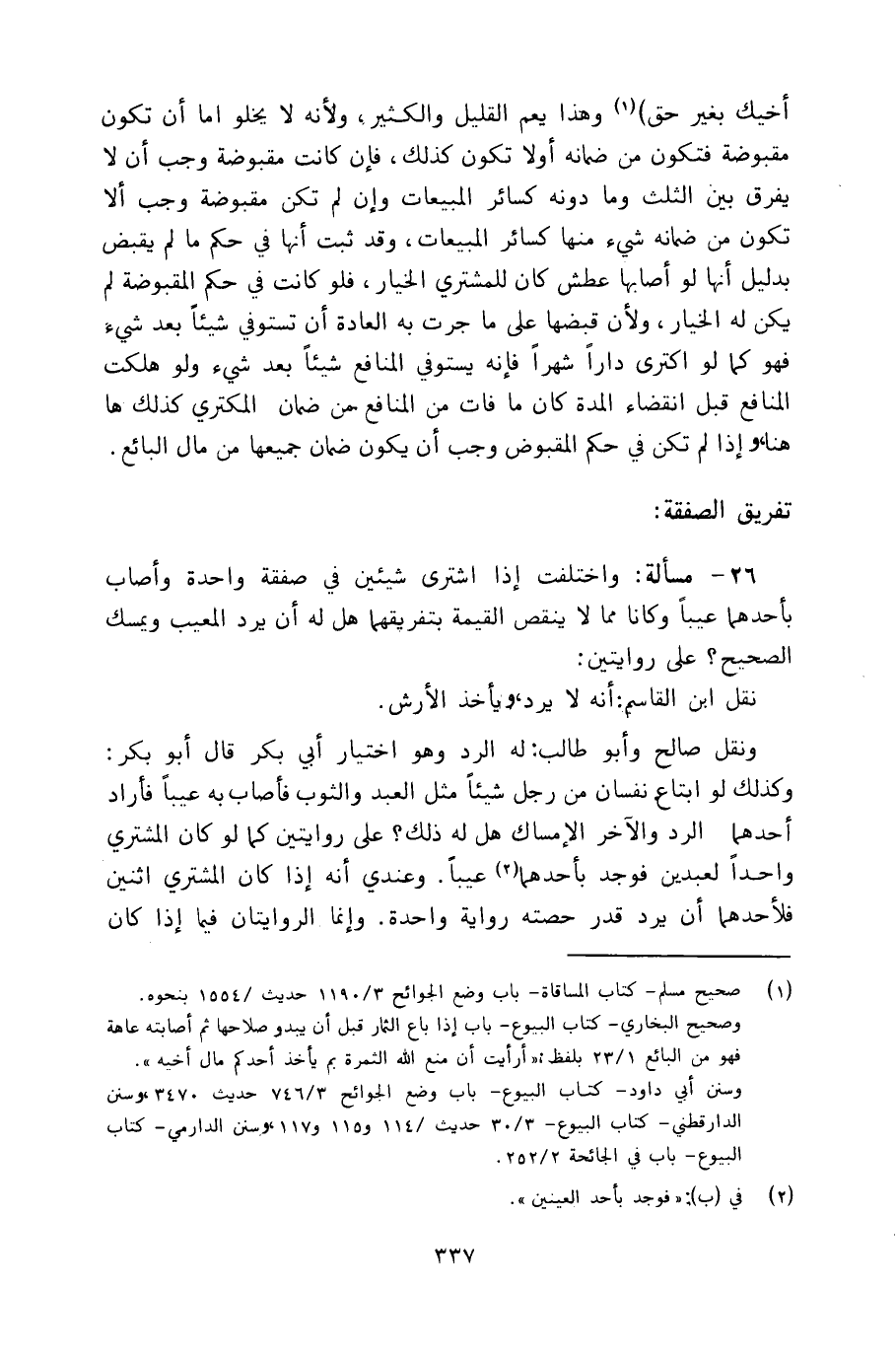 ٢٦ - مسألة: واختلفت إذا اشترى شيئين في صفقة واحدة وأصاب بأحدهما عيباً وكانا مما لا ينقص القيمة بتفريقهما هل له أن يرد المعيب ويمسك الصحيح؟ على روايتين: