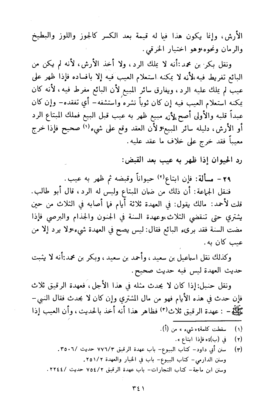 ونقل حنبل: إذا كان لا يحدث مثله في هذا الأجل، فعهدة الرقيق ثلاثة فإن حدث في هذه الأيام فهو من مال المشتري وإن كان لا يحدث فقال ـ النبي صلى الله عليه وسلم ـ: عهدة الرقيق ثلاث فظاهر هذا أنه أخذ بالحديث، وأن العيب إذا