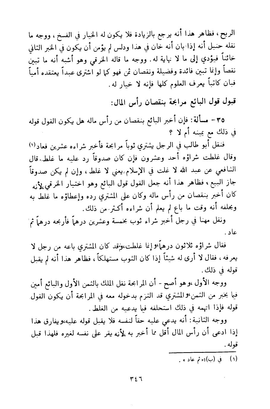 ٣٥ - مسألة: فإن أخبر البائع بنقصان من رأس ماله هل يكون القول قوله في ذلك مع يمينه أم لا؟
