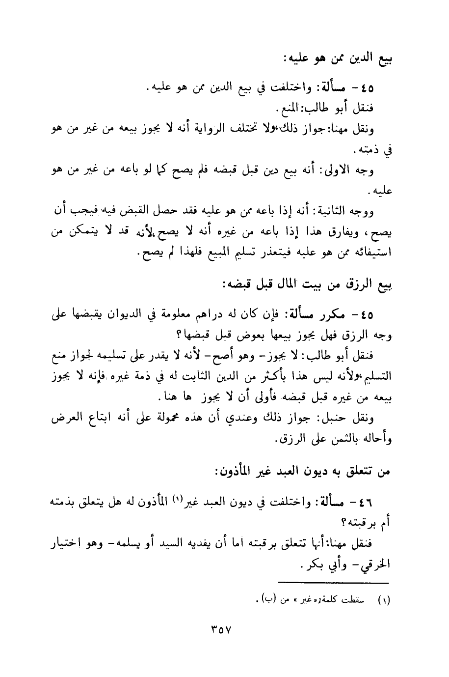 ٤٥ - مسألة: واختلفت في بيع الدين ممن هو عليه.