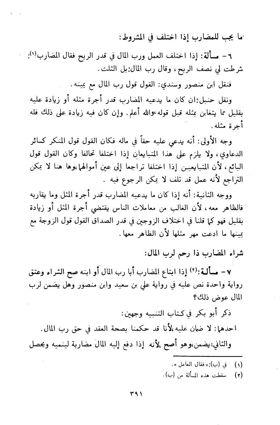 ووجه الثانية: أنه إذا كان ما يدعيه المضارب قدر أجرة المثل وما يقاربه فالظاهر معه، لأن الغالب من معاملات الناس يقتضي أجرة المثل أو زيادة بقليل فهو كما قلنا في اختلاف الزوجين في قدر الصداق القول قول الزوجة مع يمينها ما ادعت مهر مثلها لأن الظاهر معها.