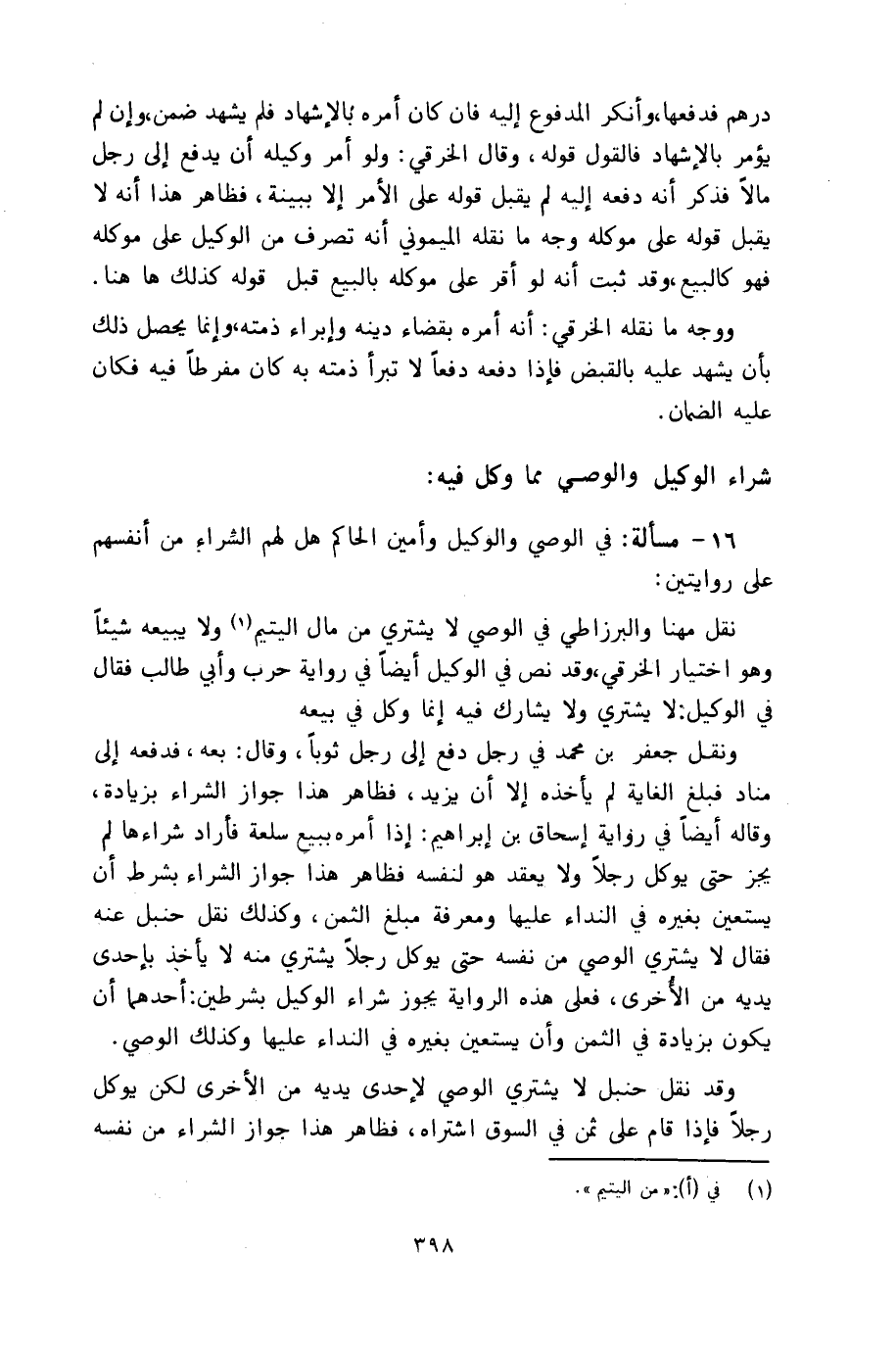 ١٦ - مسألة: في الوصي والوكيل وأمين الحاكم هل لهم الشراء من أنفسهم على روايتين:
