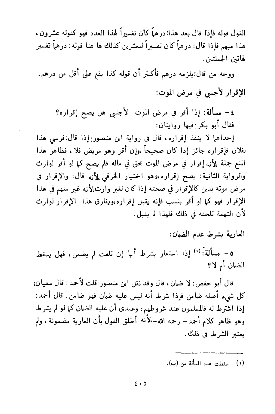 ٤ - مسألة: إذا أقر في مرض الموت لأجنبي هل يصح إقراره؟ فقال أبو بكر: فيها روايتان.