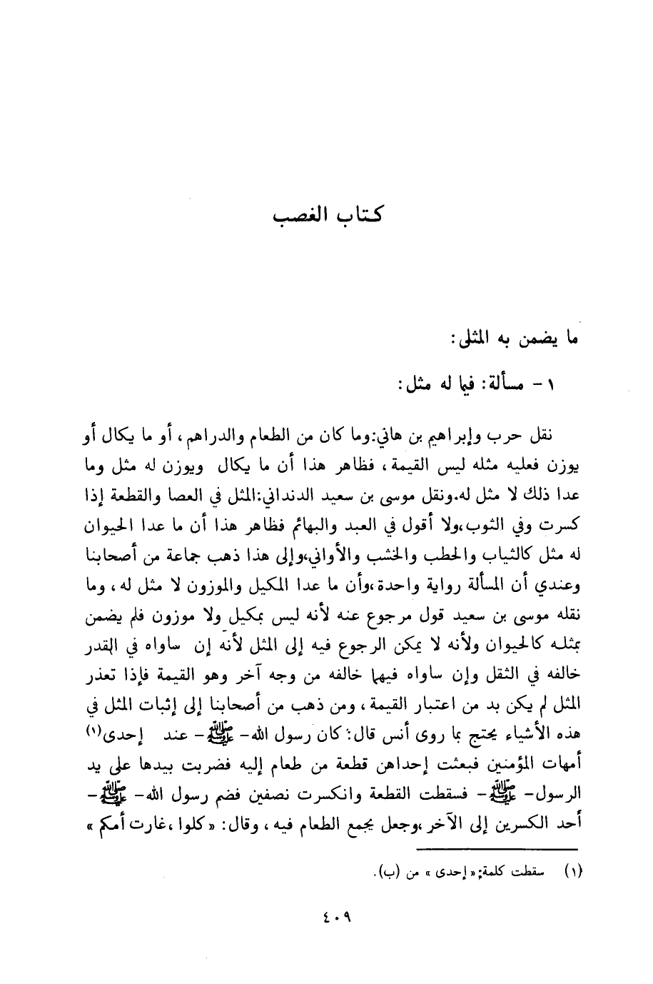 نقل حرب وإبراهيم بن هاني: وما كان من الطعام والدراهم، أو ما يكال أو يوزن فعليه مثله ليس القيمة، فظاهر هذا أن ما يكال ويوزن له مثل وما عدا ذلك لا مثل له. ونقل موسى بن سعيد الدنداني: المثل في العصا والقطعة إذا كسرت وفي الثوب، ولا أقول في العبد والبهائم فظاهر هذا أن ما عدا الحيوان له مثل كالثياب والحطب والخشب والأواني، وإلى هذا ذهب جماعة من أصحابنا وعندي أن المسألة رواية واحدة، وأن ما عدا المكيل والموزون لا مثل له، وما نقله موسى بن سعيد قول مرجوع عنه لأنه ليس بمكيل ولا موزون فلم يضمن بمثله كالحيوان ولأنه لا يمكن الرجوع فيه إلى المثل لأنه إن ساواه في القدر خالفه في الثقل وإن ساواه فيهما خالفه من وجه آخر وهو القيمة فإذا تعذر المثل لم يكن بد من اعتبار القيمة، ومن ذهب من أصحابنا إلى إثبات المثل في هذه الأشياء يحتج بما روى أنس قال: كان رسول الله ـ صلى الله عليه وسلم عند إحدى أمهات المؤمنين فبعثت إحداهن قطعة من طعام إليه فضربت بيدها على يد الرسول ـ صلى الله عليه وسلم فسقطت القطعة وانكسرت نصفين فضم رسول الله ـ صلى الله عليه وسلم أحد الكسرين إلى الآخر، وجعل يجمع الطعام فيه، وقال: كلوا، غارت أمكم