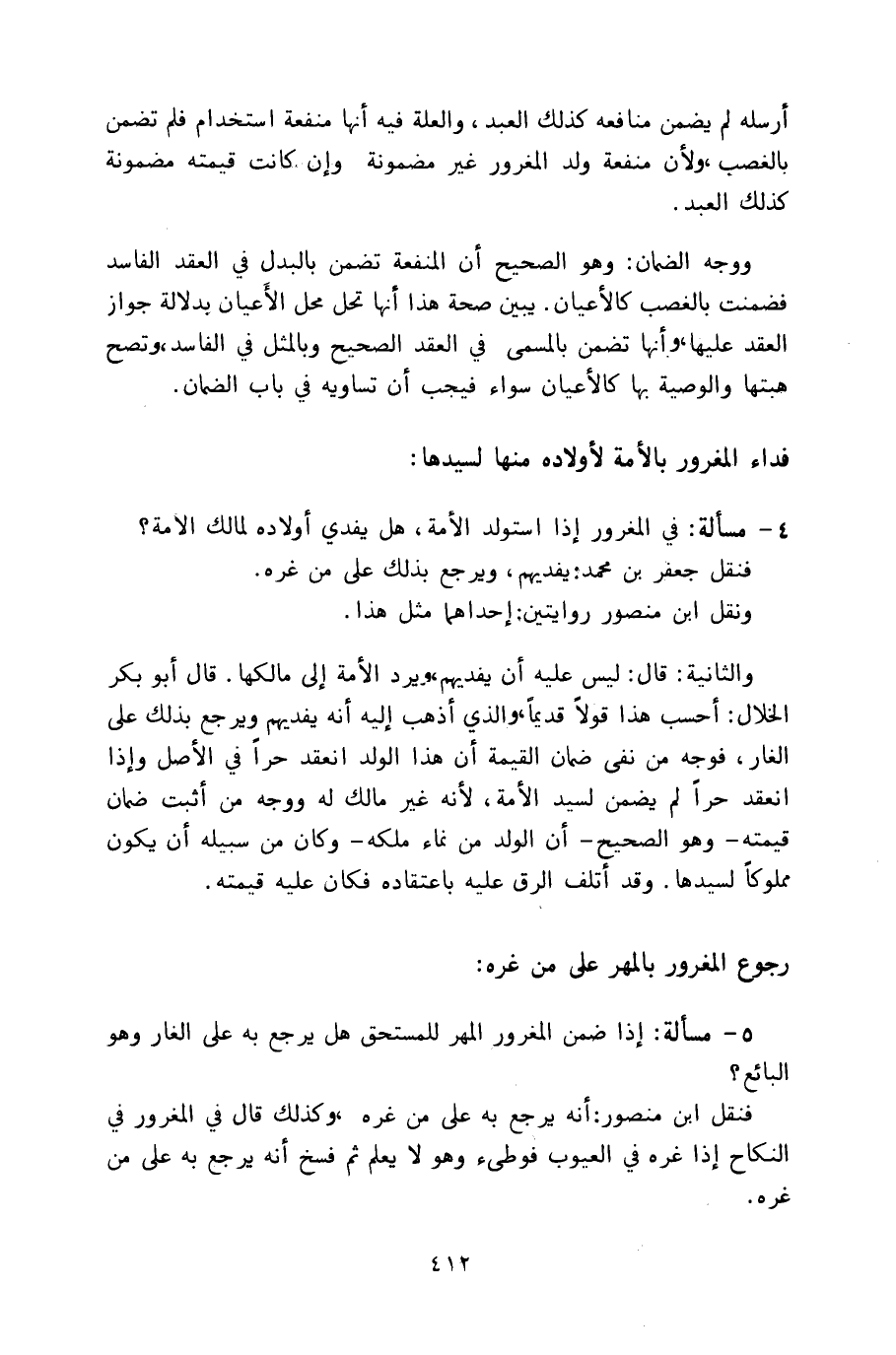 والثانية: قال: ليس عليه أن يفديهم، ويرد الأمة إلى مالكها. قال أبو بكر الخلال: أحسب هذا قولاً قديماً، والذي أذهب إليه أنه يفديهم ويرجع بذلك على الغار، فوجه من نفى ضمان القيمة أن هذا الولد انعقد حراً في الأصل وإذا انعقد حراً لم يضمن لسيد الأمة، لأنه غير مالك له ووجه من أثبت ضمان قيمته ـ وهو الصحيح ـ أن الولد من نماء ملكه ـ وكان من سبيله أن يكون مملوكاً لسيدها. وقد أتلف الرق عليه باعتقاده فكان عليه قيمته.