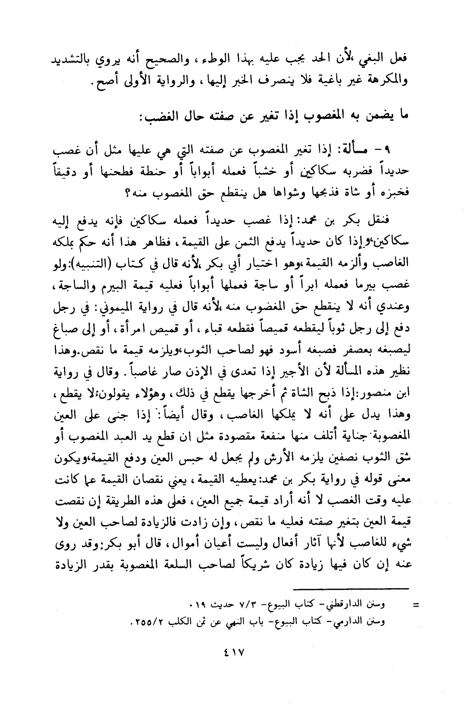 ٩ - مسألة: إذا تغير المغصوب عن صفته التي هي عليها مثل أن غصب حديداً فضربه سكاكين أو خشباً فعمله أبواباً أو حنطة فطحنها أو دقيقاً فخبزه أو شاة فذبحها وشواهاً هل ينقطع حق المغصوب منه؟
