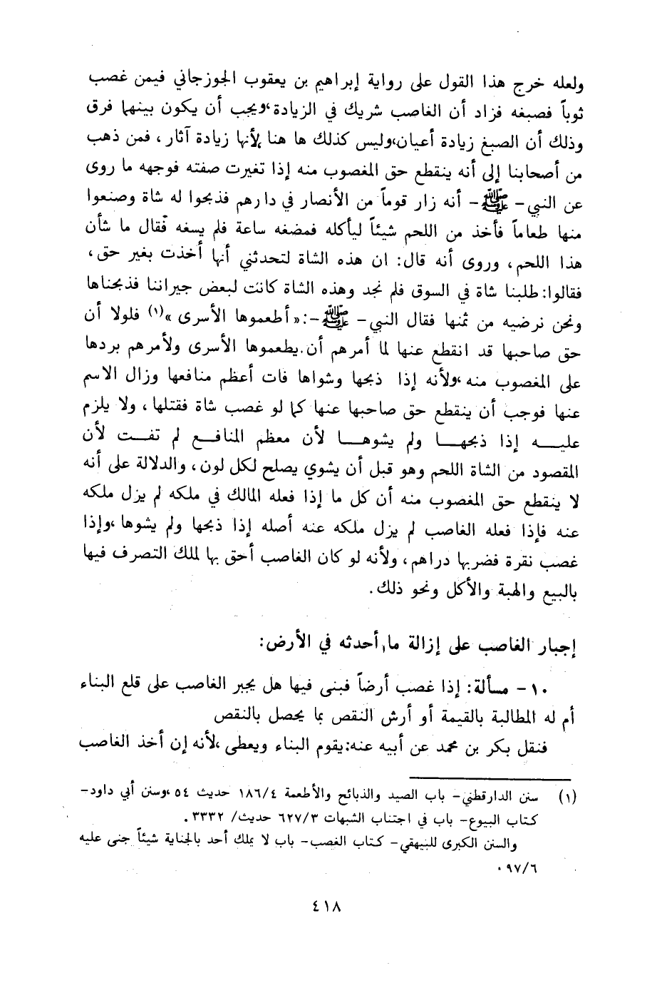 ١٠ - مسألة: إذا غصب أرضاً فبنى فيها هل يجبر الغاصب على قلع البناء أم له المطالبة بالقيمة أو أرش النقص بما يحصل بالنقص؟.
