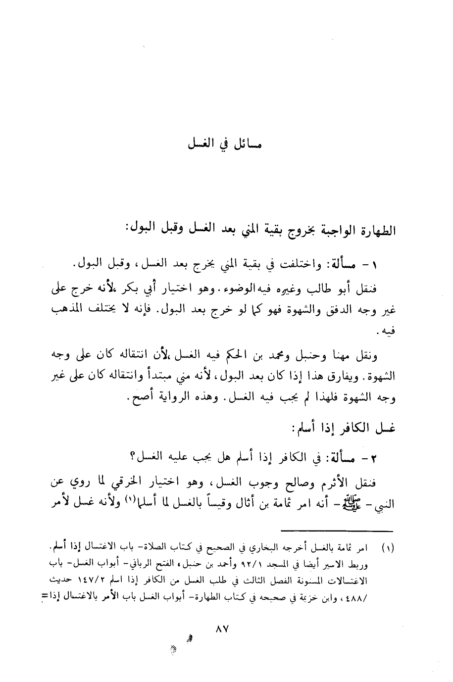 فنقل الأثرم وصالح وجوب الغسل، وهو اختيار الخرقي لما روي عن ـ النبي صلى الله عليه وسلم ـ أنه أمر ثمامة بن أثال وقيساً بالغسل لما أسلما ولأنه غسل لأمر