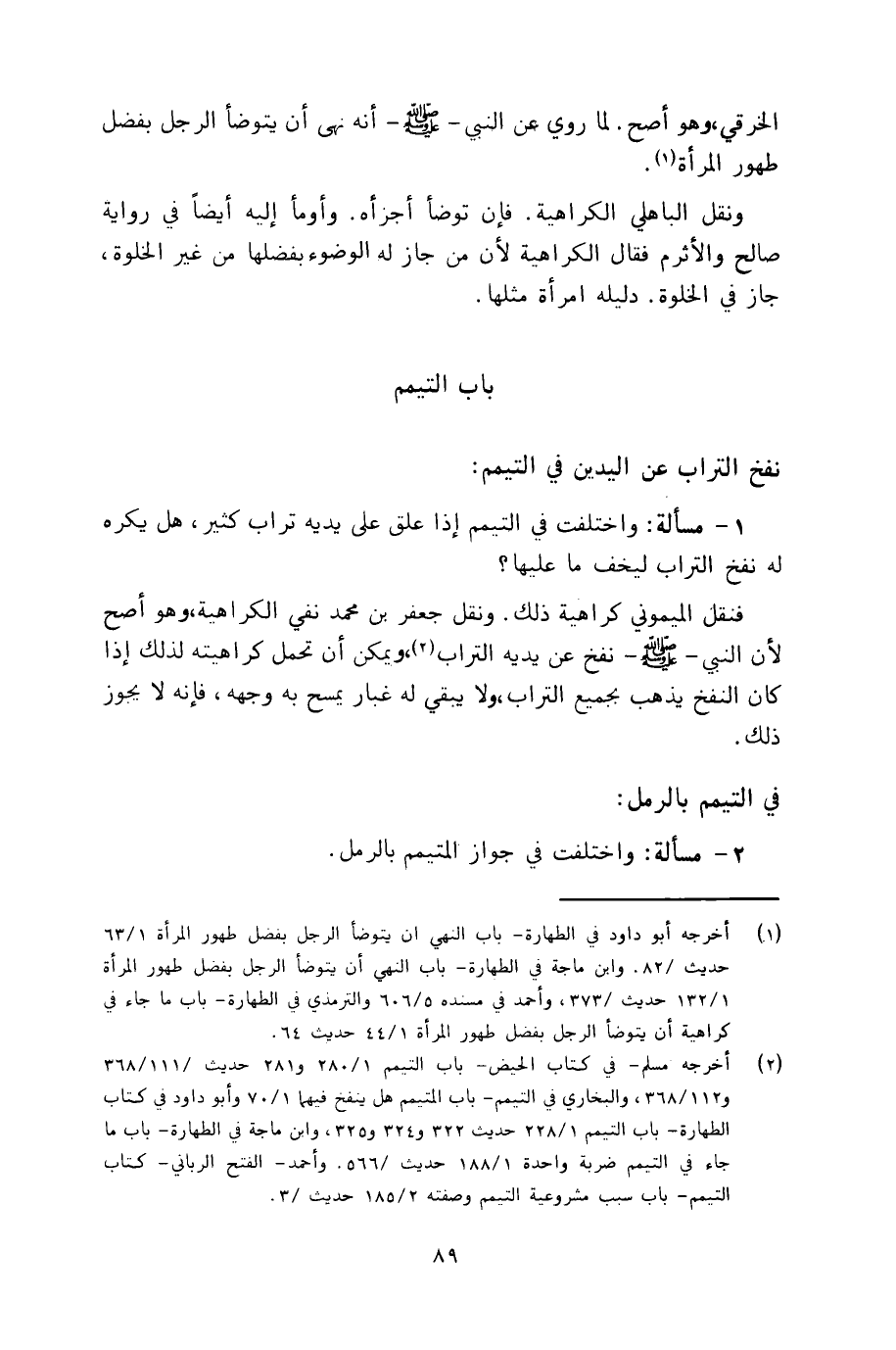 الخرقي، وهو أصح. لما روي عن ـ النبي صلى الله عليه وسلم ـ أنه نهى أن يتوضأ الرجل بفضل طهور المرأة.