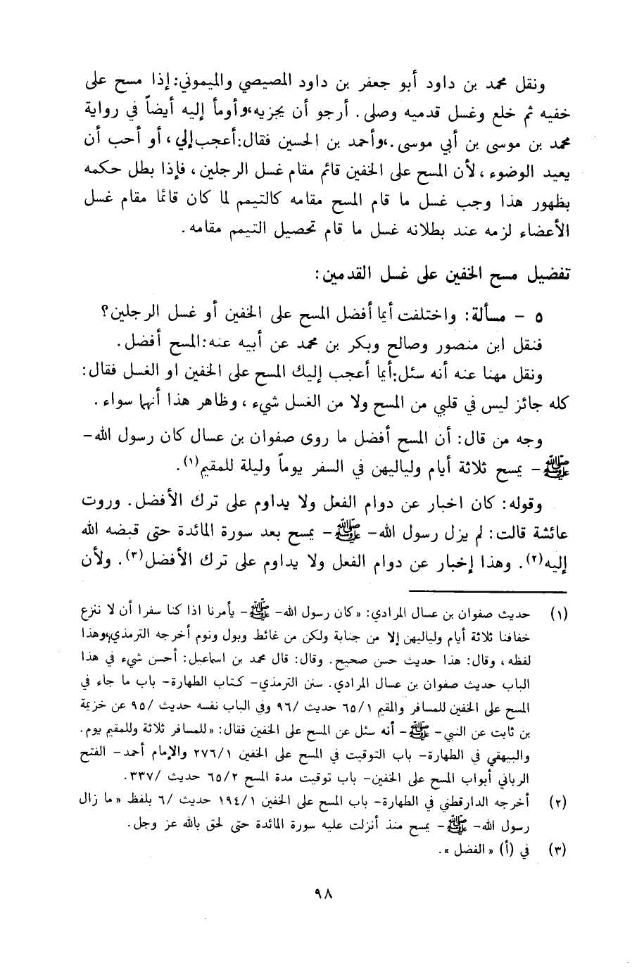 ٥ - مسألة: واختلفت أيما أفضل المسح على الخفين أو غسل الرجلين؟