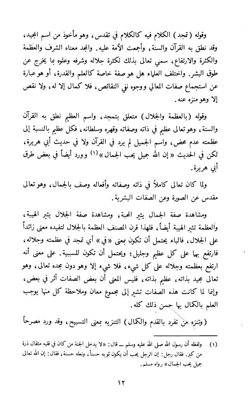 ولما كان تعالى كاملا في ذاته وصفاته وأفعاله وصف بالجمال وهو تعالى مقدس عن الصورة وعن الصفات البشرية.