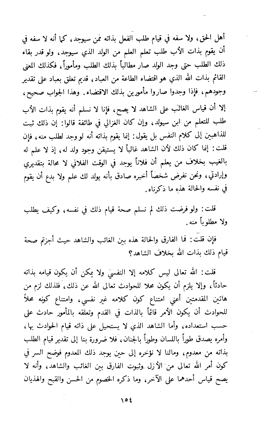أهل الحق ولا سفه في قيام طلب الفعل بذاته ممن سيوجد كما أنه لا سفه في أن يقوم بذات الأب طلب تعلم العلم من الولد الذي سيوجد ولو قدر بقاء ذلك الطلب حتى وجد الولد صار مطالبا بذلك الطلب ومأمورا فكذلك المعنى القائم بذات الله الذي هو اقتضاء الطاعة من العباد قديم تعلق بعباد على تقدير وجودهم فإذا صاروا مأمورين بذلك الاقتضاء وهذا الجواب الصحيح إلا أن قياس الغائب على الشاهد لا يصح فإنا نسلم أنه يقوم بذات الأب طلب للتعلم من ابن سيولد وإن كان الغزالي في طائفة قالوا إن ذلك ثبت للذاهبين إلى كلام النفس بل يقول إنما يقوم بذاته أنه لو وجد لطلب منه فإن قلت إنما كان ذلك لأن الشاهد غالبا لا يستيقن وجود ولد له إذ لا علم له بالغيب بخلاف من يعلم أن فلانا يوجد في الوقت الفلاني لا محالة بتقديري وإرادتي ونحن نفرض شخصا أخبره صادق بأنه يولد لك علم ولا بدع أن يقوم في نفسه والحالة هذه ما ذكرناه.