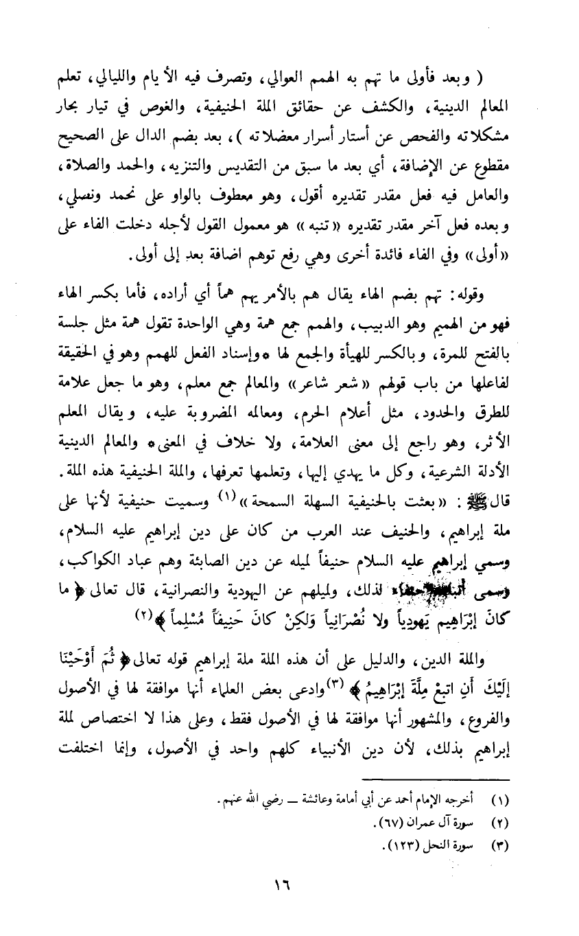 والملة الدين والدليل على أن هذه الملة ملة إبراهيم قوله تعالى: {ثُمَّ أَوْحَيْنَا إِلَيْكَ أَنِ اتَّبِعْ مِلَّةَ إِبْرَاهِيمَ} ٣ وادعى بعض العلماء أنها موافقة لها في الأصول والفروع والمشهور أنها موافقة لها في الأصول فقط وعلى هذا لا اختصاص لملة إبراهيم بذلك لأن دين الأنبياء كلهم واحد في الأصول وإنما اختلفت