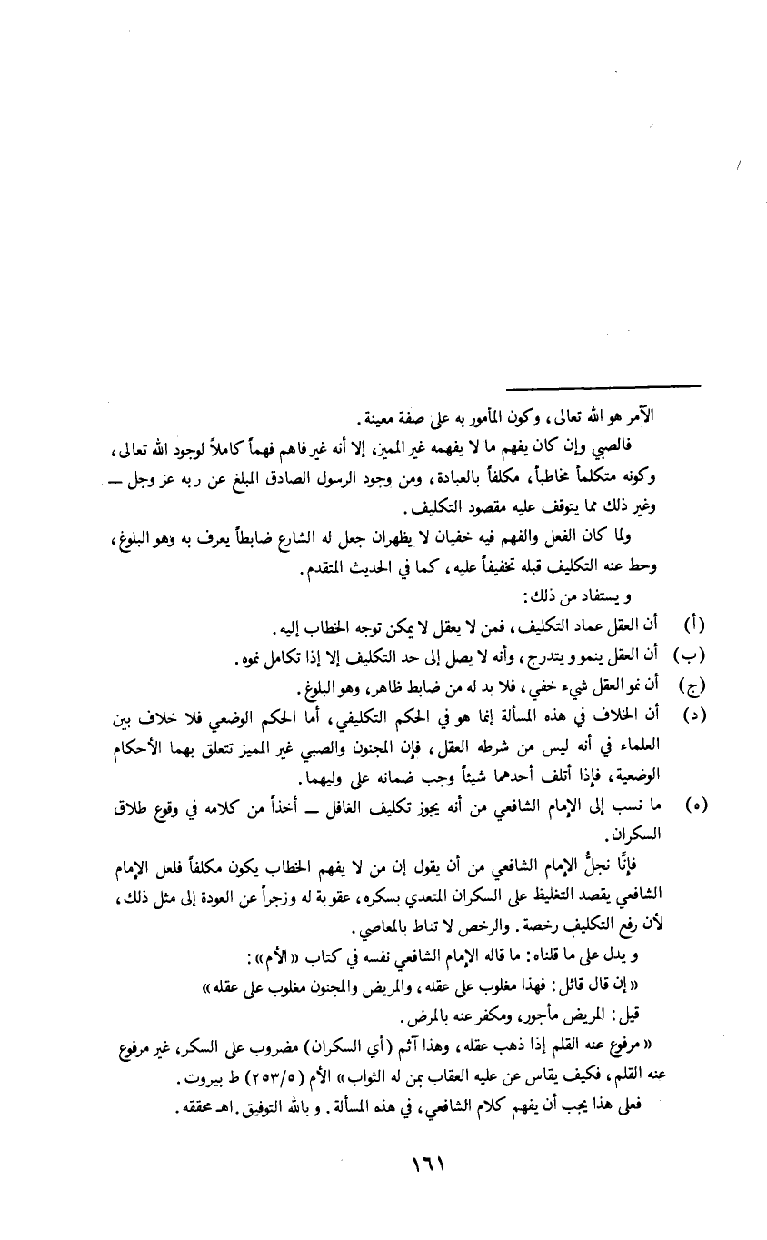 = "ج" أن نمو العقل شيء خفي فلا بد له من ضابط ظاهر وهو البلوغ "د" أن الخلاف في هذه المسألة إنما هو في الحكم التكليفي أما الحكم الوضعي فلا خلاف بين العلماء في أنه ليس من شرطه العقل فإن المجنون والصبي غير المميز تتعلق بهما الأحكام الوضعية فإذا أتلف أحدهما شيئا وجب ضمانه على وليهما.