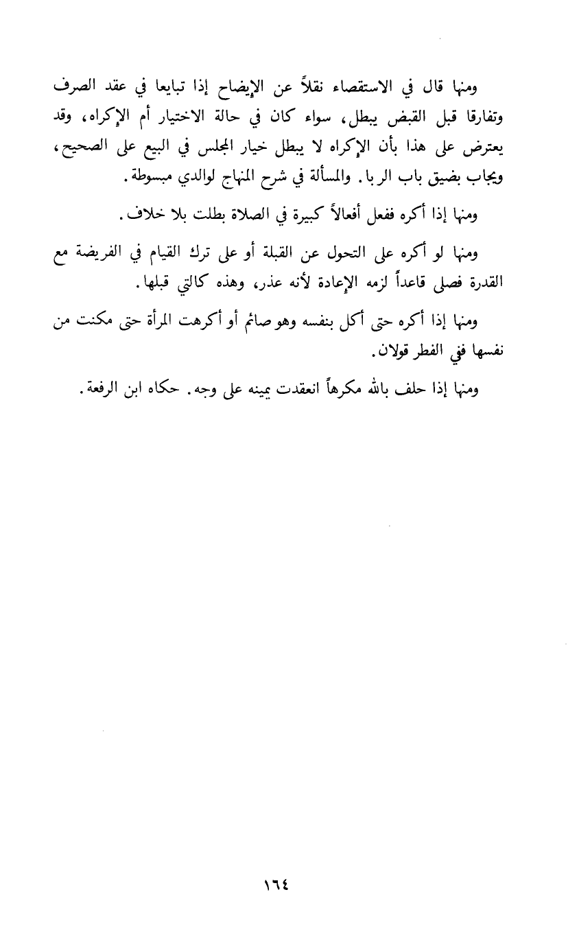 ومنها: قال في الاستقصاء نقلا عن الإيضاح إذا تبايعا في عقد الصرف وتفارقا قبل القبض يبطل سواء كان في حالة الاختيار أم الإكراه وقد يعترض على هذا بأن الإكراه لا يبطل خيار المجلس في البيع على الصحيح ويجاب بضيق باب الربا والمسألة في شرح المنهاج لوالدي بطلت مبسوطة.