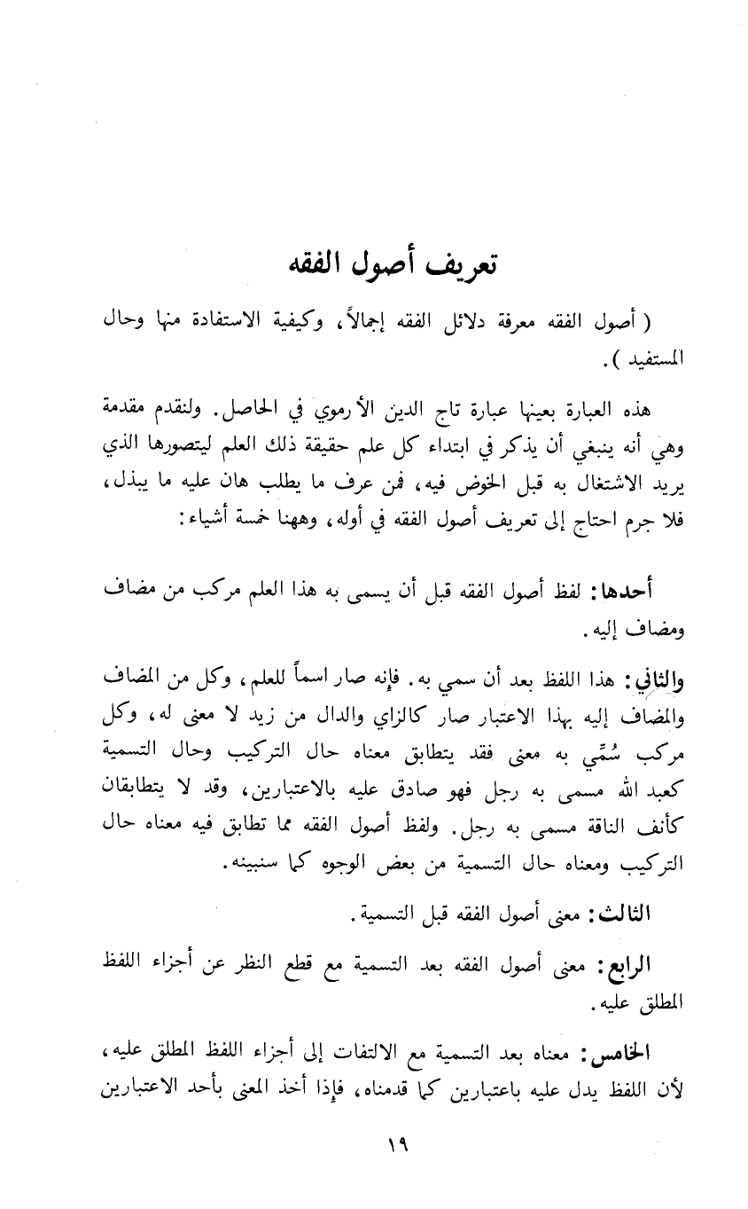 هذه العبارة بعينها عبارة تارج الدين الأرموي في الحاصل ولنقدم مقدمة وهي أنه ينبغي أن يذكر في ابتداء كل علم حقيقة ذلك العلم ليتصورها الذي يريد الاشتغال به قبل الخوض فيه فمن عرف ما يطلب هان عليه ما يبذل فلا جرم احتاج إلى تعريف أصول الفقه في أوله وههنا خمسة أشياء: