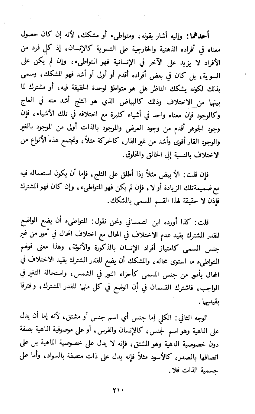 قلت كذا أورده ابن التلمساني ونحن نقول المتواطئ أن يضع الواضع للقدر المشترك بقيد عدم الاختلاف في المحال مع اختلاف المحال في أمور من غير جنس المسمى كامتياز أفراد الإنسان بالذكورة والأنوثة وهذا معنى قولهم المتواطئ ما استوى محاله والمشكك أن يضع للقدر المشترك بقيد الاختلاف في المحال بأمور من جنس المسمى كأجزاء النور في الشمس واستحالة التغير في الواجب فاشترك القسمان في أن الوضع في كل منهما للقدر المشترك وافترقا بقيديهما.