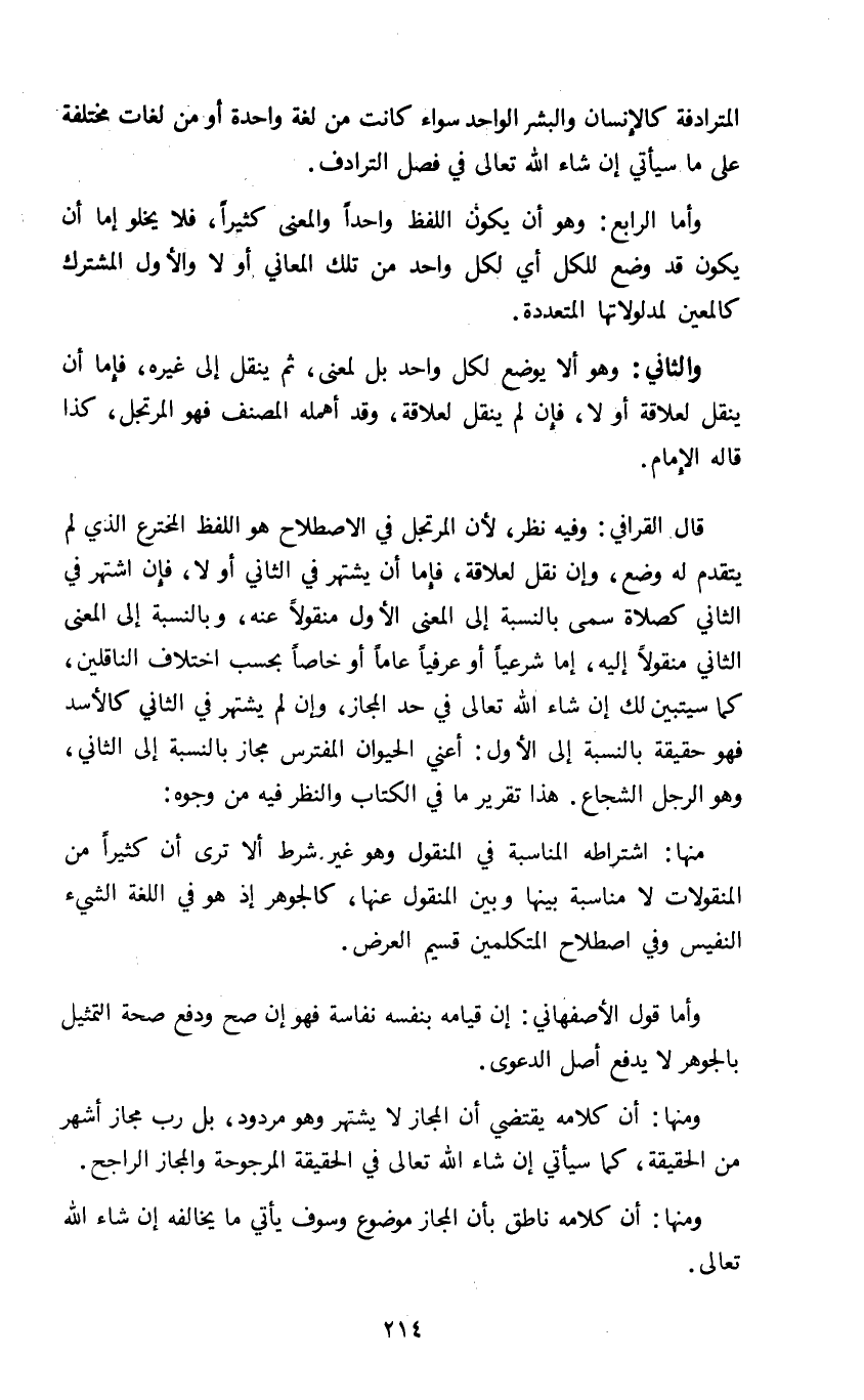 قال القرافي وفيه نظر لأن المرتجل في الاصطلاح هو اللفظ المخترع الذي لم يتقدم له وضع وإن نقل لعلاقة فإما أن يشتهر في الثاني فإن اشتهر في الثاني كصلاة سمى بالنسبة إلى المعنى الأول منقولا عنه وبالنسبة إلى المعنى الثاني منقولا إليه إما شرعيا أو عرفيا عاما أو خاصا بحسب اختلاف الناقلين كما سيتبين لك إن شاء الله تعالى في حد المجاز وإن لم يشتهر في الثاني كالأسد فهو حقيقة بالنسبة إلى الأول أعني الحيوان المفترس مجاز بالنسبة إلى الثاني وهو الرجل الشجاع هذا تقرير ما في الكتاب والنظر فيه من وجوه: