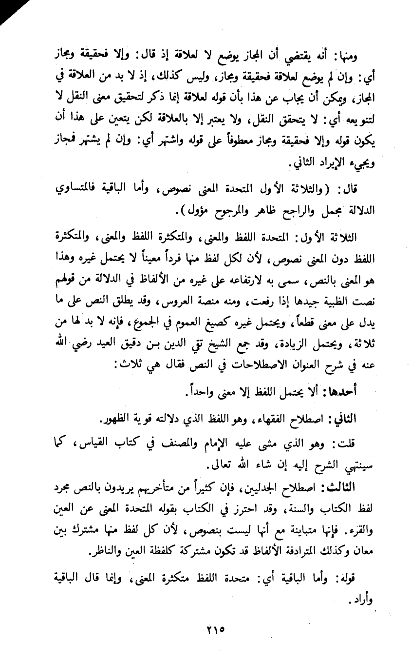 الثالث: اصطلاح الجدليين فإن كثيرا من متأخريهم يريدون بالنص مجرد لفظ الكتاب والسنة وقد احترز في الكتاب بقوله المتحدة المعنى عن العين والقرء فإنها متباينة مع أنها ليست بنصوص لأن كل لفظ منها مشترك بين معان وكذلك المترادفة الألفاظ قد تكون مشتركة كلفظة العين والناظر.