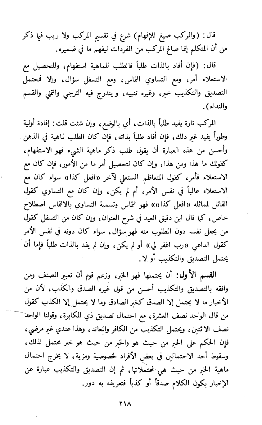 المركب تارة يفيد طلبا بالذات أي بالوضع وإن شئت قلت إفادة أولية وطورا يفيد غير ذلك فإن أفاد طلبا بذاته فإن كان الطلب لماهية في الذهن وأحسن من هذه العبارة أن يقول طلب ذكر ماهية الشيء فهو الاستفهام كقولك ما هذا ومن هذا وإن كان لتحصيل أمر ما من الأمور فإن كان مع الاستعلاء فأمر كقول المتعاظم المستعلي لآخر افعل كذا سواء كان مع الاستعلاء عاليا في نفس الأمر أم لم يكن وإن كان مع التساوي كقول القائل لمماثله افعل كذا فهو التماس وتسمية التساوي بالالتماس اصطلاح خاص كما قال ابن دقيق العيد في شرح العنوان وإن كان من التسفل كقول من يجعل نفس دون المطلوب منه فهو سؤال سواء كان دونه في نفس الأمر كقول الداعي رب اغفر لي أو لم يكن وإن لم يفد بالذات طلبا فإما أن يحتمل التصديق والتكذيب أو لا.