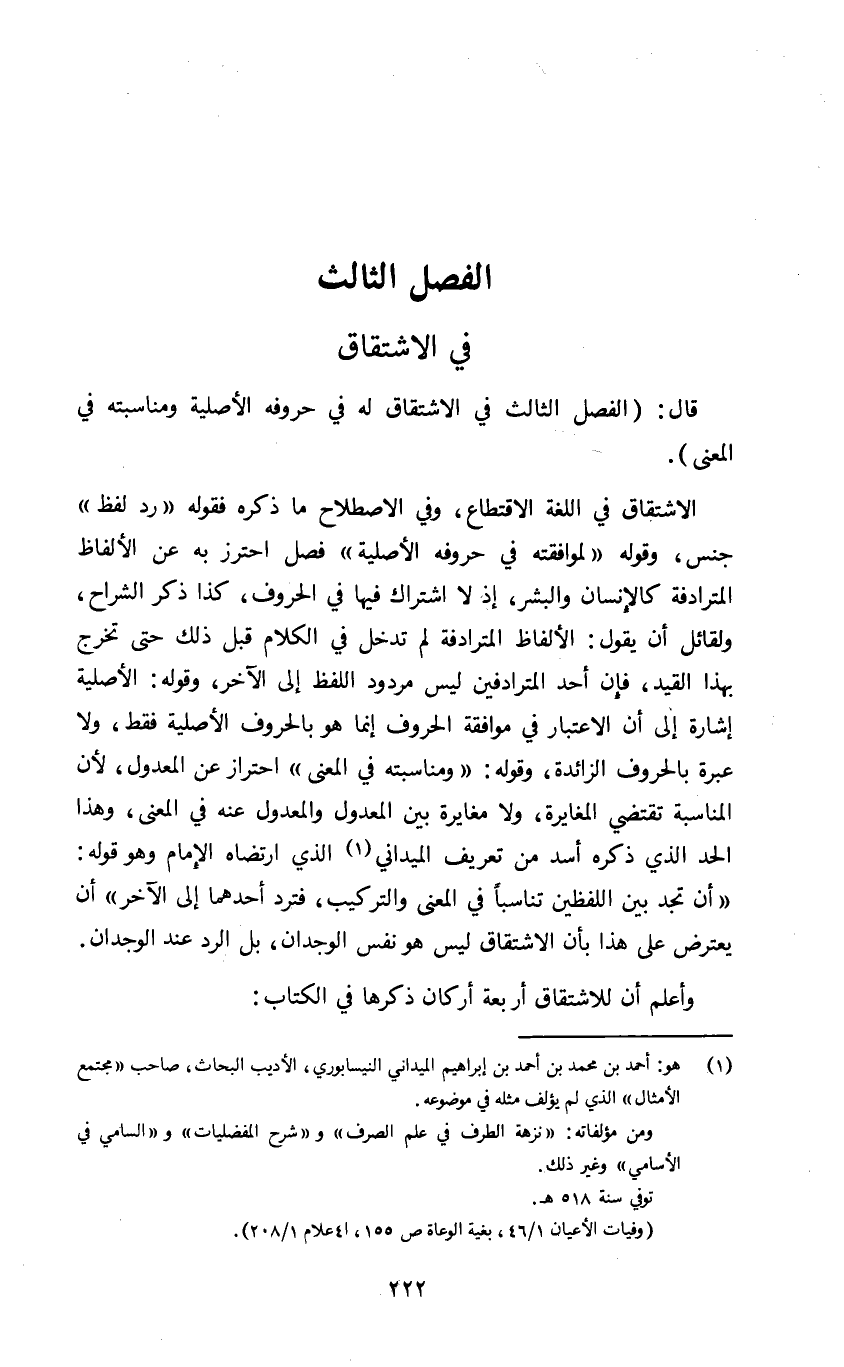 قال الفصل الثالث في الاشتقاق له في حروفه الأصلية ومناسبته في المعنى.