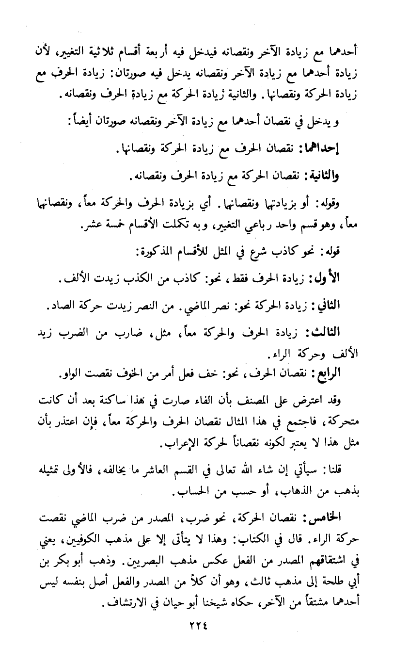 الخامس: نقصان الحركة نحو ضرب المصدر من ضرب الماضي نقصت حركة الراء قال في الكتاب وهذا لا يتأتى إلا على مذهب الكوفيين يعني في اشتقاقهم المصدر من الفعل عكس مذهب البصريين وذهب أبو بكر بن أبي طلحة إلى مذهب ثالث وهو أن كلا من المصدر والفعل أصل بنفسه ليس أحدهما مشتقا من الآخر حكاه شيخنا أبو حيان في الارتشاف.
