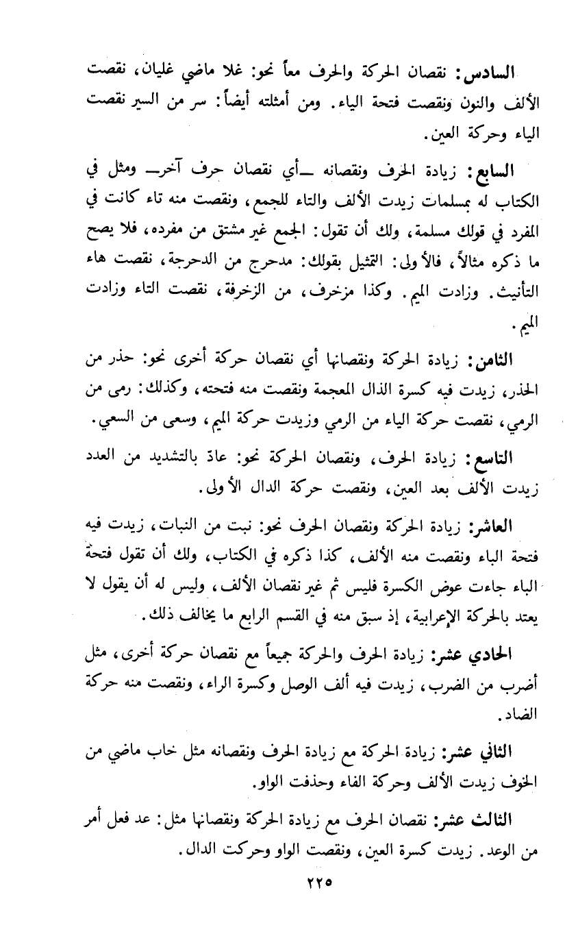 الثامن: زيادة الحركة ونقصانها أي نقصان حركة أخرى نحو حذر من الحذر زيدت فيه كسرة الذال المعجمة ونقصت منه فتحته وكذلك رمى من الرمي نقصت حركت الياء من الرمي وزيدت حركة الميم وسعى من السعي.