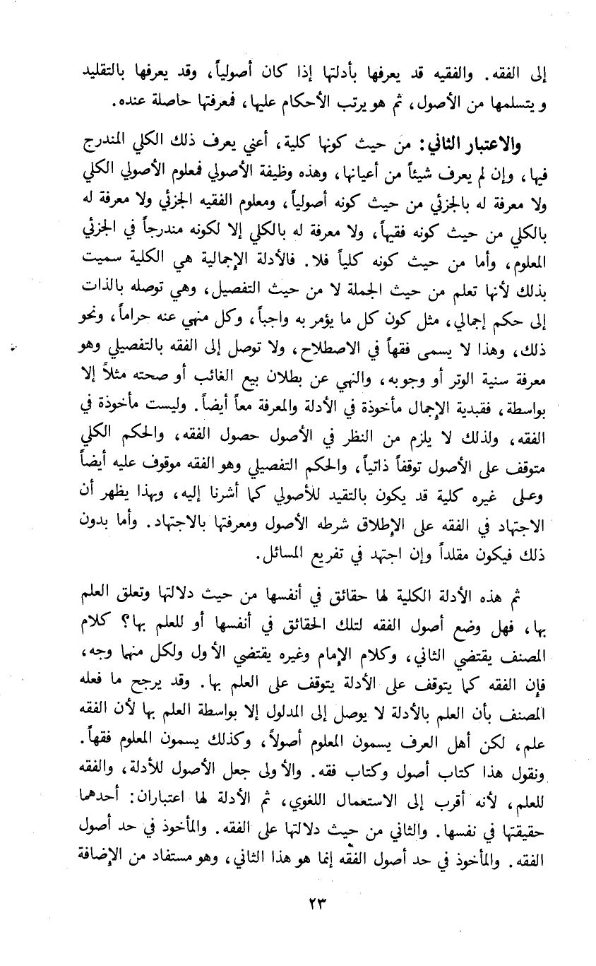 والاعتبار الثاني: من حيث كونها كلية أعني يعرف ذلك الكلي المندرج فيها وإن لم يعرف شيئا من أعيانها وهذه وظيفة الأصولي فمعلوم الأصولي الكلي ولا معرفة له بالجزئي من حيث كونه أصوليا ومعلوم الفقيه الجزئي ولا معرفة له بالكلي من حيث كونه فقيها ولا معرفة له بالكلي إلا لكونه مندرجا في الجزئي المعلوم وأما من حيث كونه كليا فلا فالأدلة الإجمالية هي الكلية سميت بذلك لأنها تعلم من حيث الجملة لا من حيث التفصيل وهي توصله بالذات إلى حكم الإجمالي مثل كون كل ما يؤمر به واجبا وكل منهي عنه حراما ونحو ذلك وهذا لا يسمى فقها في الاصطلاح ولا توصل إلى الفقه بالتفصيلي وهو معرفة سنية الوتر أو وجوبه والنهي عن بطلان بيع الغائب أو صحته مثلا إلا بواسطة فقبدية الإجمال مأخوذة في الأدلة والمعرفة معا أيضا وليست مأخوذة في الفقه ولذلك لا يلزم من النظر في الأصول حصول الفقه والحكم الكلي متوقف على الأصول توقفا ذاتيا والحكم التفصيلي وهو الفقه موقوف عليه أيضا وعلى غيره كلية قد يكون بالتقيد للأصولي كما أشرنا إليه وبهذا يظهر أن الاجتهاد في الفقه على الإطلاق شرطه الأصول ومعرفتها بالاجتهاد وأما بدون ذلك فيكون مقلدا وإن اجتهد في تفريع المسائل.