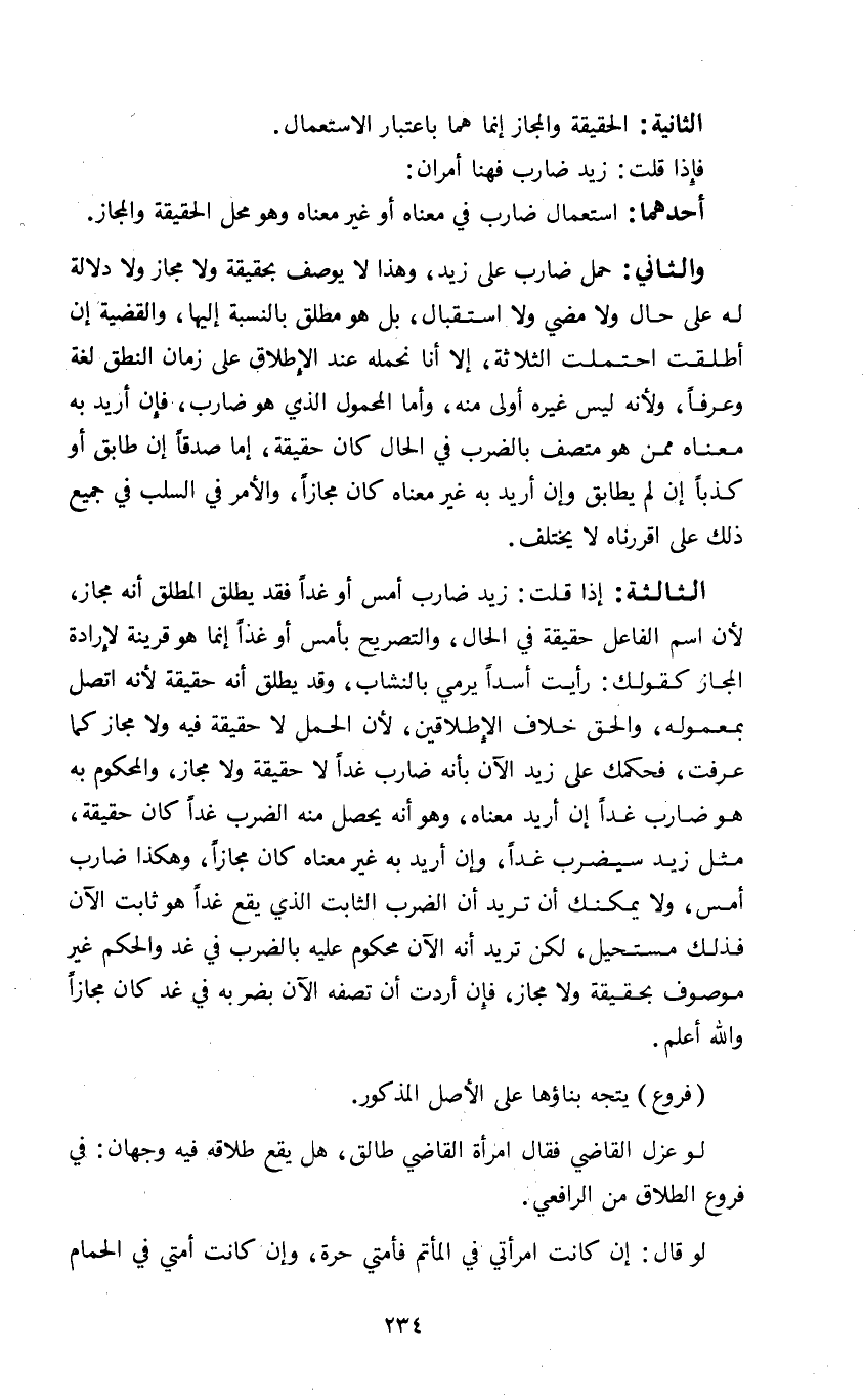 الثالثة: إذا قلت زيد ضارب أمس أو غدا فقد يطلق المطلق أنه مجاز لأن اسم الفاعل حقيقة في الحال والتصريح بأمس أو غدا إنما هو قرينة لإرادة المجاز كقولك رأيت أسدا يرمي بالنشاب وقد يطلق أنه حقيقة لأنه اتصل بمعموله والحق خلاف الإطلاقين لأن الحمل لا حقيقة فيه ولا مجاز كما عرفت فحكمك على زيد الآن بأنه ضارب غذا لا حقيقة ولا مجاز والمحكوم به هو ضارب غدا إن أريد معناه وهو أن يحصل منه الضرب غذا كان حقيقة مثل زيد سيضرب غدا وإن أريد به غير معناه كان مجازا وهكذا ضارب أمس ولا يمكنك أن تريد أن الضرب الثابت الذي يقع غدا هو ثابت الآن فذلك مستحيل لكن تريد أنه الآن محكوم عليه بالضرب في غذ والحكم غير موصوف بحقيقة ولا مجاز فإن أردت أن تصفه الآن بضربه في غد كان مجازا والله أعلم.