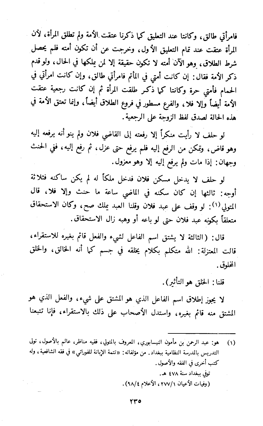١ هو عبد الرحمن بن مأمون النيسابوري المعروف بالمتولي فقيه مناظر عالم بالأصول تولى التدريس بالمدرسة النظامية ببغداد من مؤلفاته تتمة الإبانة للفوراتي في فقه الشافعية وله كتب أخرى في الفقه والأصول.