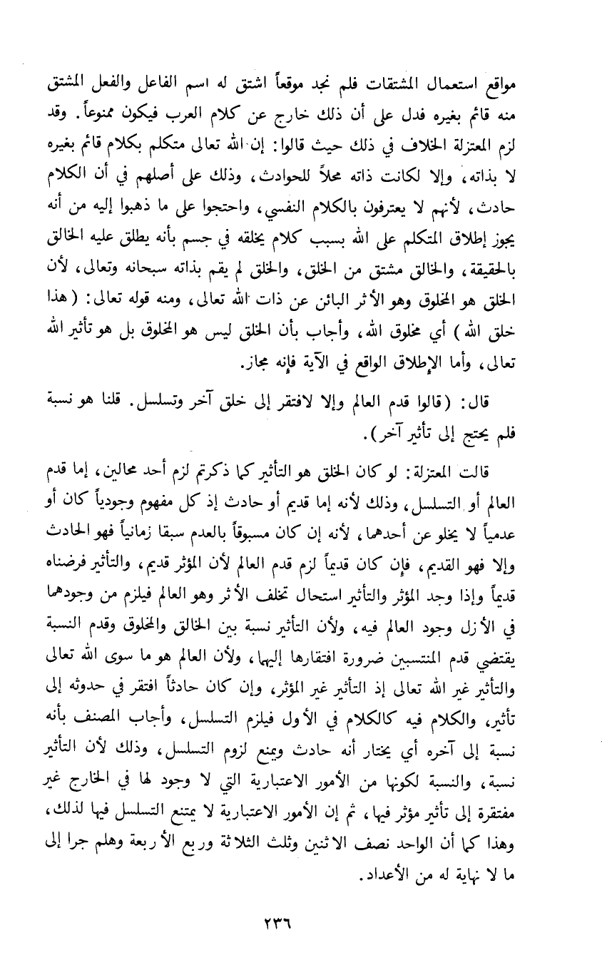 قالت المعتزلة لو كان الخلق هو التأثير كما ذكرتم لزم أحد محالين إما قدم العالم أو التسلسل وذلك لأنه إما قديم أو حادث إذ كل مفهوم وجوديا كان أو عدميا لا يخلو عن أحدهما لأنه إن كان مسبوقا بالعدم سبقا زمانيا فهو الحادث وإلا فهو القديم فإن كان قديما لزم قدم العالم لأن المؤثر قديم والتأثير فرضناه قديما وإذا وجد المؤثر والتأثير استحال تخلف الأثر وهو العالم فيلزم من وجودهما في الأزل وجود العالم فيه ولأن التأثير نسبة بين الخالق والمخلوق وقدم النسبة يقتضي قدم المنتسبين ضرورة افتقارها إليهما ولأن العالم هو ما سوى الله تعالى والتأثير غير الله تعالى إذ التأثير غير المؤثر وإن كان حادثا افتقر في حدوثه إلى تاثير والكلام فيه كالكلام في الأول فيلزم التسلسل وأجاب المصنف بأنه نسبة إلى آخره أي يختار أنه حادث ويمنع لزوم التسلسل وذلك لأن التأثير نسبة والنسبة لكونها من الأمور الاعتبارية التي لا وجود لها في الخارج غير مفتقرة إلى تأثير مؤثر فيها ثم إن الأمور الاعتبارية لا يمتنع التسلسل فيها لذلك وهذا كما أن الواحد نصف الاثنين وثلث الثلاثة وربع الأربعة وهلم جرا إلى ما لا نهاية له من الأعداد