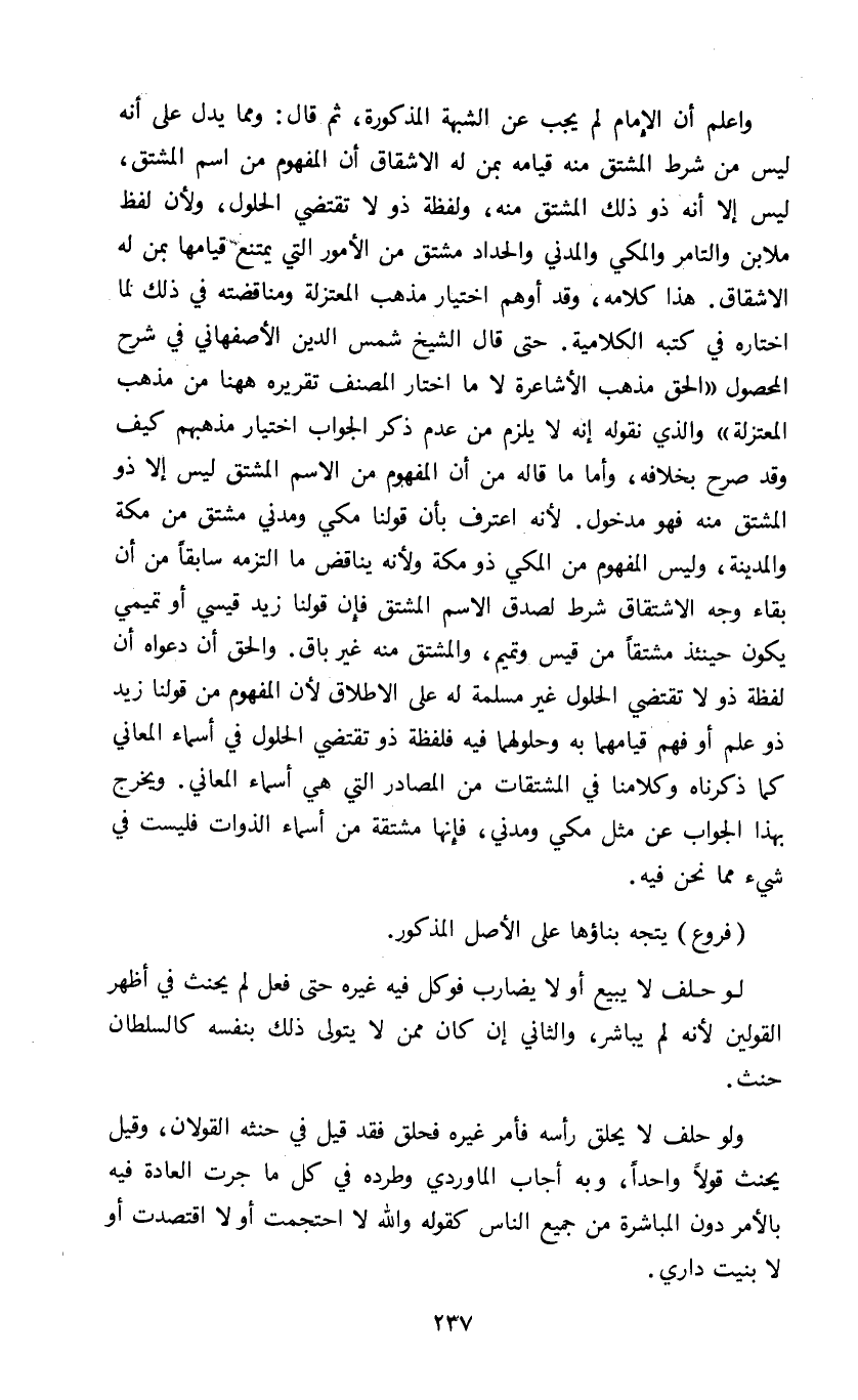 واعلم أن الإمام لم يجب عن الشبهة المذكورة ثم قال ومما يدل على أنه ليس من شرط المشتق منه قيامه بمن له الاشقاق أن المفهوم من اسم المشتق ليس إلا أنه ذو ذلك المشتق منه ولفظة ذو لا يقتضي الحلول ولأن لفظ ملابن والتامر والمكي والمدني والحداد مشتق من الأمور التي يمتنع قيامها بمن له الاشقاق هذا كلامه وقد أوهم اختيار مذهب المعتزلة ومناقضته في ذلك لما اختاره في كتبه الكلامية حتى قال الشيخ شمس الدين الأصفهاني في شرح المحصول الحق مذهب الأشاعرة لا ما اختار المصنف تقريره ههنا من مذهب المعتزلة والذي نقوله إنه لا يلزم من عدم ذكر الجواب اختيار مذهبهم كيف وقد صرح بخلافه وأما ما قاله من أن المفهوم من الاسم المشتق ليس إلا ذو المشتق منه فهو مدخول لأنه اعترف بأن قولنا مكي ومدني مشتق من مكة والمدينة وليس المفهوم من المكي ذو مكة ولأنه يناقض ما التزمه سابقا من أن بقاء وجه الاشتقاق شرط لصدق الاسم المشتق فإن قولنا زيد قيسي أو تميمي يكون حينئذ مشتقا من قيس وتميم والمشتق منه غير باق والحق أن دعواه أن لفظة ذو لا تقتضي الحلول غير مسلمة له على الإطلاق لأن المفهوم من قولنا زيد ذو علم أو فهم قيامهما به وحلولهما فيه فلفظة ذو تقتضي الحلول في أسماء المعاني كما ذكرناه وكلامنا في المشتقات من المصادر التي هي أسماء المعاني ويخرج بهذا الجواب عن مثل مكي ومدني فإنها مشتقة من أسماء الذوات فليست في شيء مما نحن فيه.