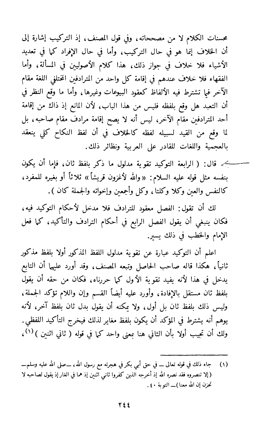 لك أن تقول الفصل معقود للترادف فلا مدخل لأحكام التوكيد فيه فكان ينبغي أن يقول الفصل الرابع في أحكام الترادف والتأكيد كما فعل الإمام والخطب في ذلك يسير.