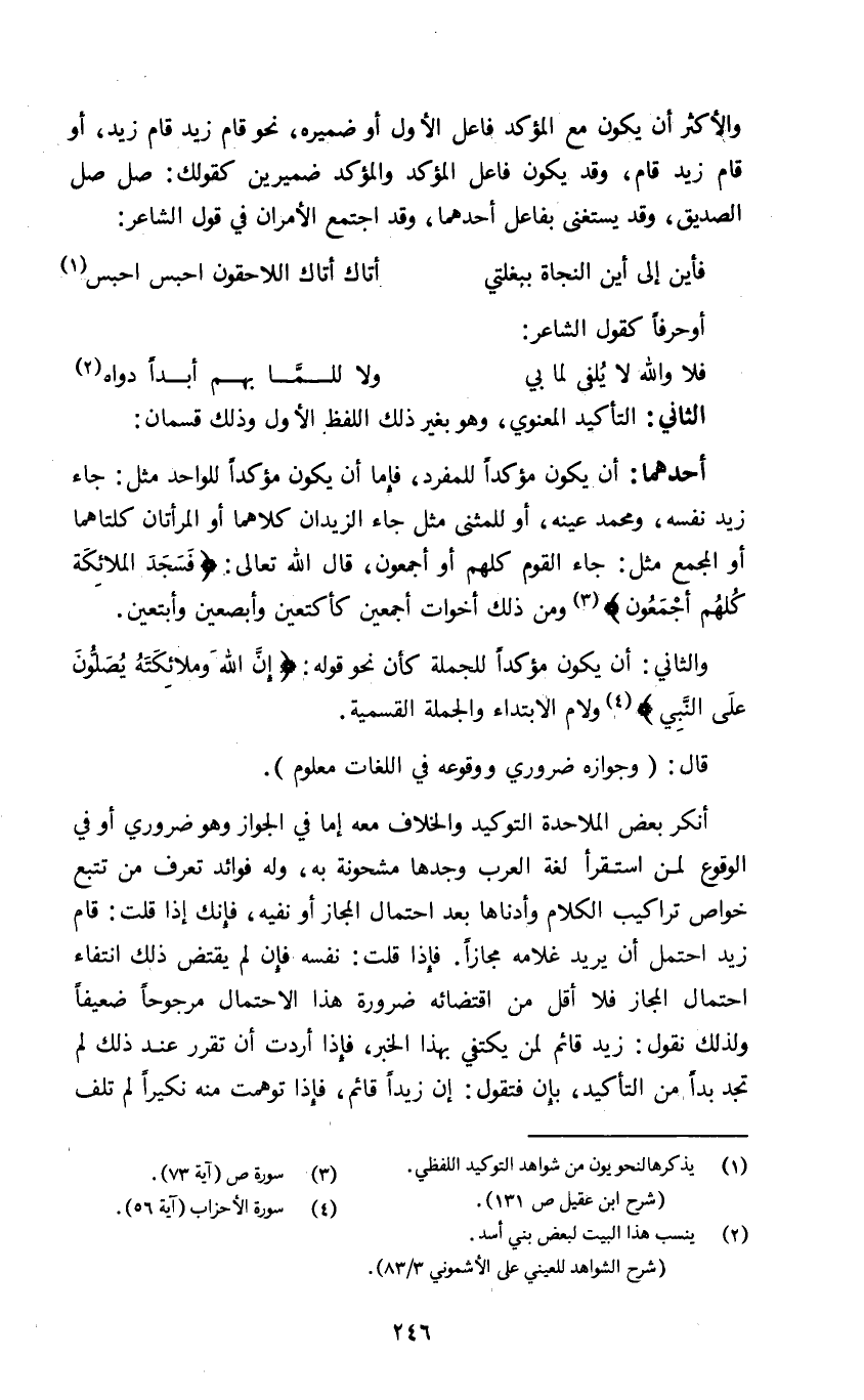 والأكثر أن يكون مع المؤكد فاعل الأول أو ضميره نحو قام زيد قام زيد أو قام زيد قام وقد يكون فاعل المؤكد والمؤكد ضميرين كقولك صل, صل الصديق وقد يستغنى بفاعل أحدهما وقد اجتمع الأمران في قول الشاعر: