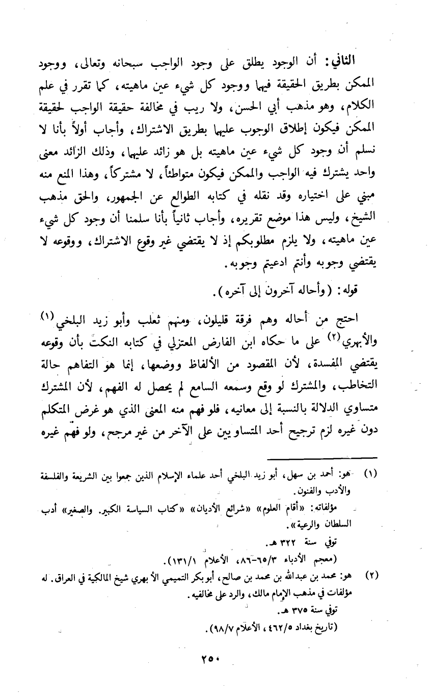 الثاني: أن الوجود يطلق على وجود الواجب سبحانه وتعالى ووجود الممكن بطريق الحقيقة فيهما ووجود كل شيء عين ماهيته كما تقرر في علم الكلام وهو مذهب أبي الحسن ولا ريب في مخالفة حقيقة الواجب لحقيقة الممكن فيكون إطلاق الوجوب عليهما بطريق الاشتراك وأجاب أولا بأنا لا نسلم أن وجود كل شيء عين ماهيته بل هو زائد عليهما وذلك الزائد معنى واحد يشترك فيه الواجب والممكن فيكون متواطئا لا مشتركا وهذا المنع منه مبني على اختياره وقد نقله في كتابه الطوالع عن الجمهور والحق مذهب الشيخ وليس هذا موضع تقريره وأجاب ثانيا بأنا سلمنا أن وجود كل شيء عين ماهيته ولا يلزم مطلوبكم إذ لا يقتضي غير وقوع الاشتراك ووقوعه لا يقتضي وجوبه وأنتم ادعيتم وجوبه.