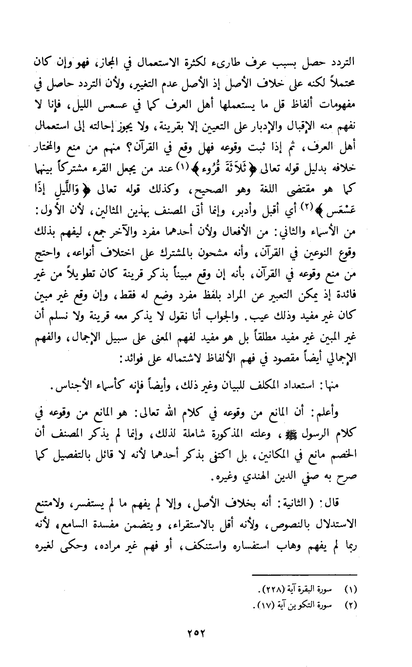 التردد حصل بسبب عرف طارئ لكثرة الاستعمال في المجاز فهو وإن كان محتملا لكنه على خلاف الأصل إذ الأصل عدم التغيير ولأن التردد حاصل في مفهومات ألفاظ قل ما يستعملها أهل العرف كما في عسعس الليل فإنا لا نفهم منه الإقبال والإدبار على التعيين إلا بقرينه ولا يجوز إحالته إلى استعمال أهل العرف ثم إذا ثبت وقوعه فهل وقع في القرآن منهم من منع والمختار خلافه بدليل قوله تعالى: {ثَلاثَةَ قُرُوءٍ} ١ عند من يجعل القرء مشتركا بينهما كما هو مقتضى اللغة وهو الصحيح وكذلك قوله تعالى: {وَاللَّيْلِ إِذَا عَسْعَسَ} ٢ أي أقبل وأدبر وإنما أتى المصنف بهذين المثالين لأن الأول من الأسماء والثاني من الأفعال ولأن أحدهما مفرد والآخر جمع ليفهم بذلك وقوع النوعين في القرآن وأنه مشحون بالمشترك على اختلاف أنواعه واحتج من منع وقوعه في القرآن بأنه إن وقع مبينا بذكر قرينة كان تطويلا من غير فائدة إذ يمكن التعبير عن المراد بلفظ مفرد وضع له فقط وإن وقع غير مبين كان غير مفيد وذلك عيب والجواب أنا نقول لا يذكر معه قرينة ولا نسلم أن غير المبين غير مفيد مطلقا بل هو مفيد لفهم المعنى على سبيل الإجمال والفهم الإجمالي أيضا مقصود في فهم الألفاظ لاشتماله على فوائد.